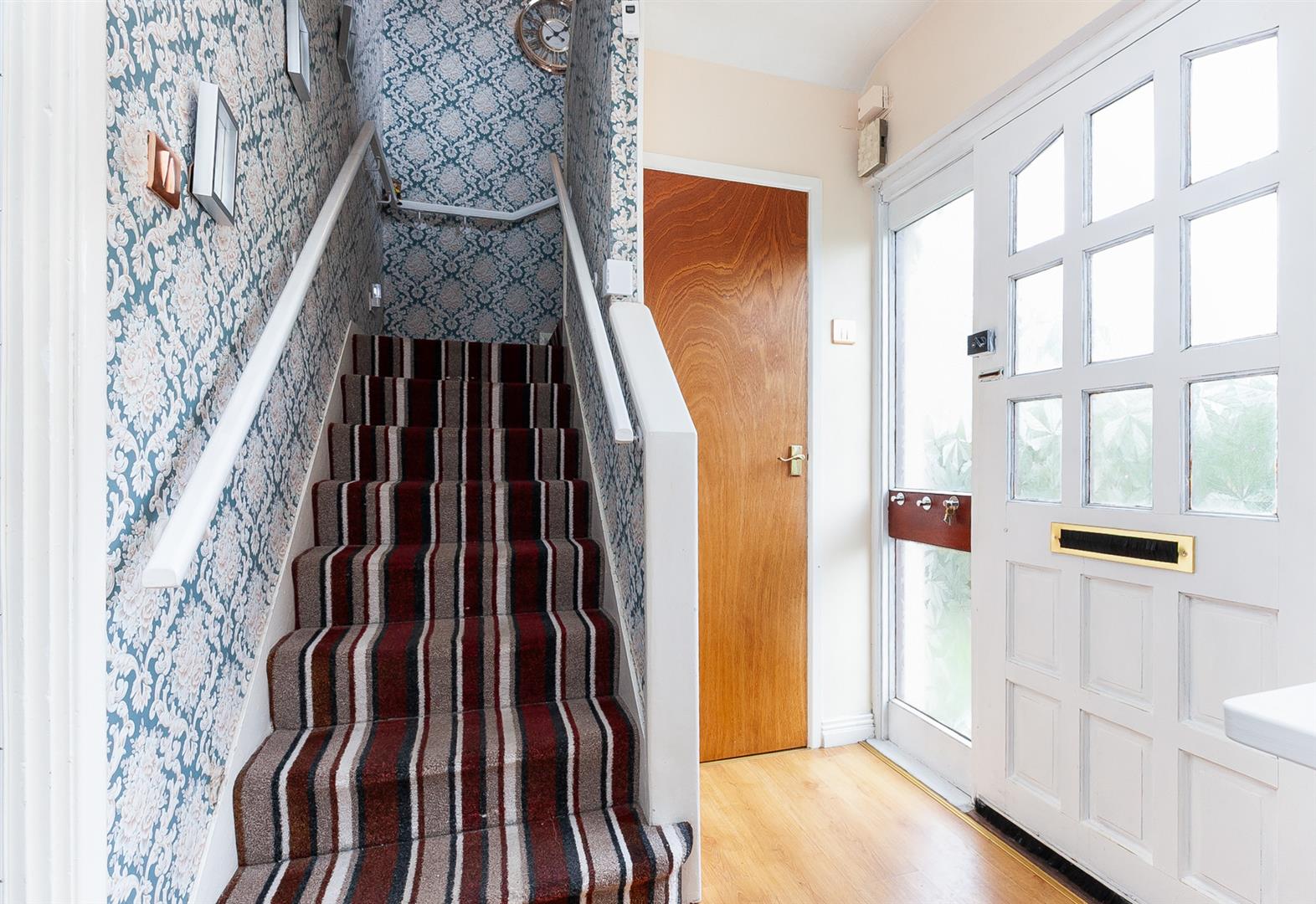 Hardwood glass panelled front door with matching side screen. Wood laminate floor covering. Stairwell to first floor.