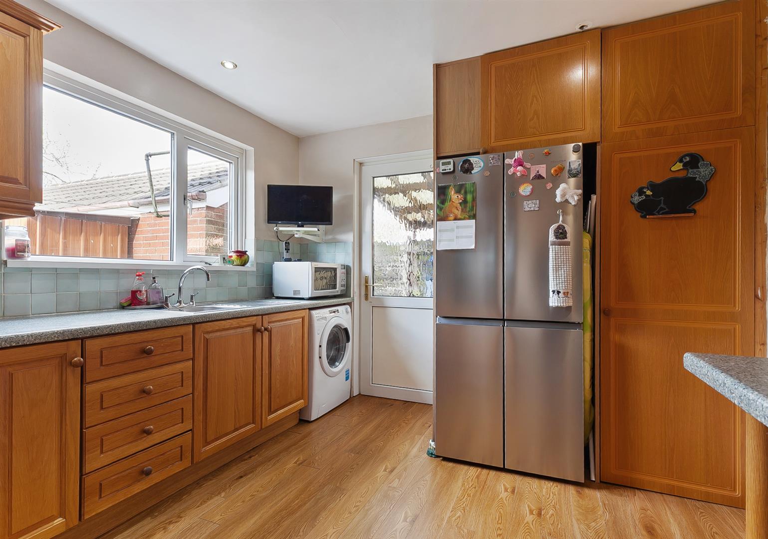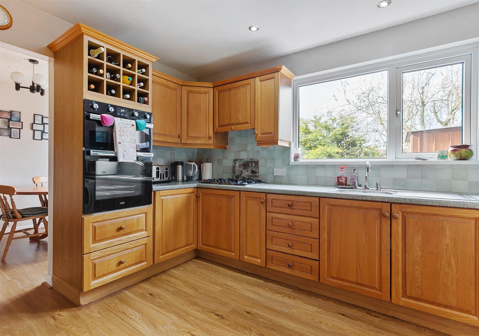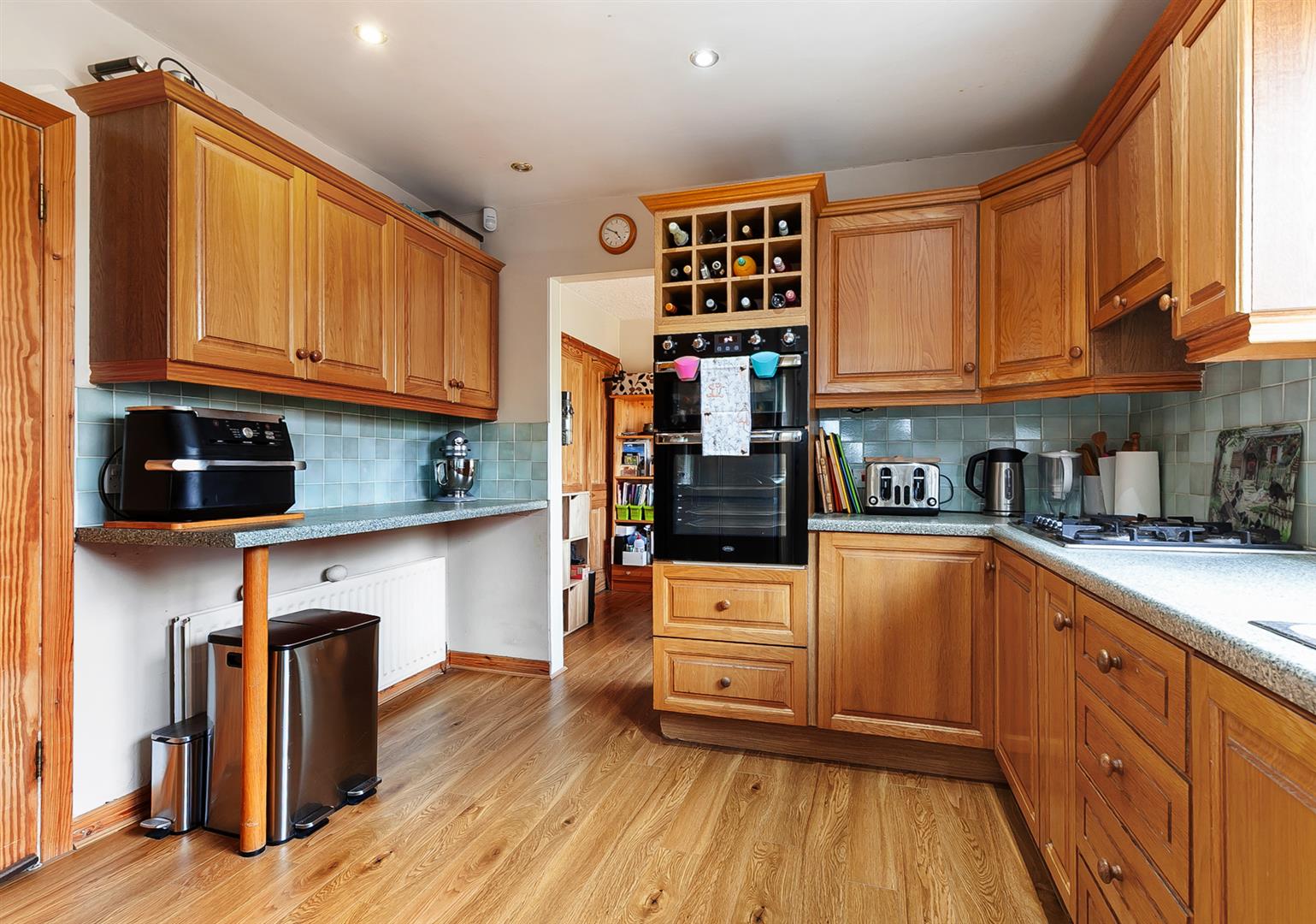 Modern fitted kitchen with range of high and low level storage units with contrasting granite effect melamine worktop. Stainless steel sink unit with draining bay. Integrated gas hob with extractor hood over. Integrated double ovens. Space for American style fridge freezer. Plumbed and space for washing machine. Built in wine rack. Splashback tiling to walls. Wood laminate floor covering. PVC double glazed door leading to rear garden.