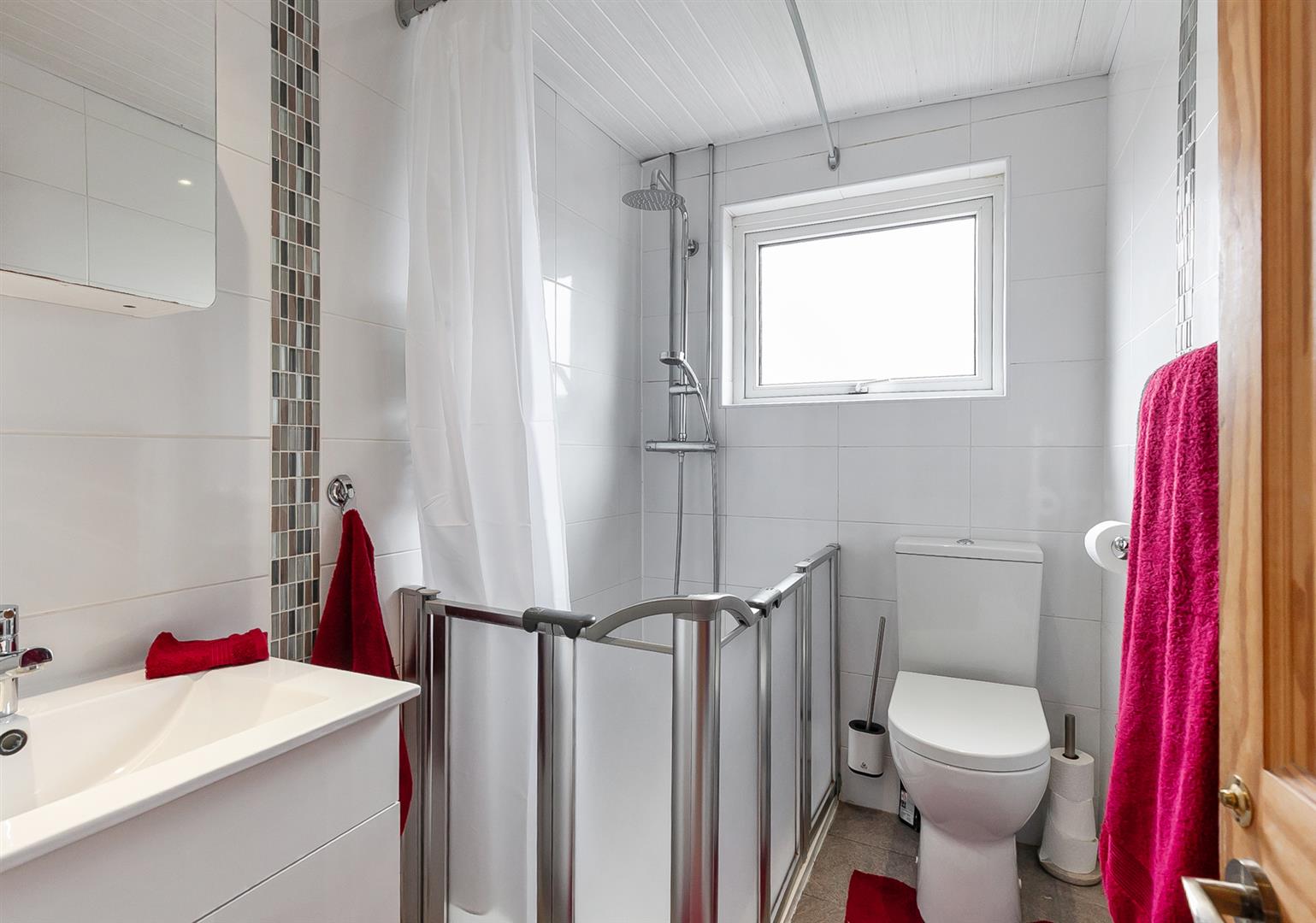 White, three piece suite comprising shower tray, vanity unit and WC. Thermostat controlled main shower unit with drench shower head. Towel radiator.