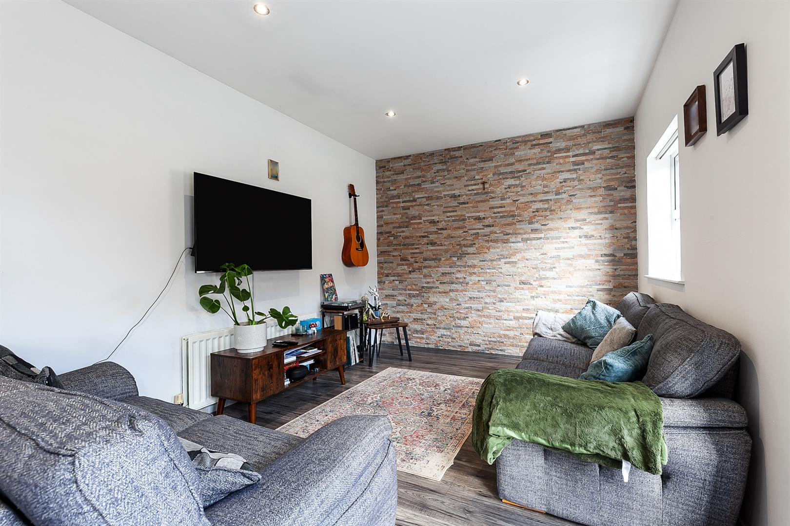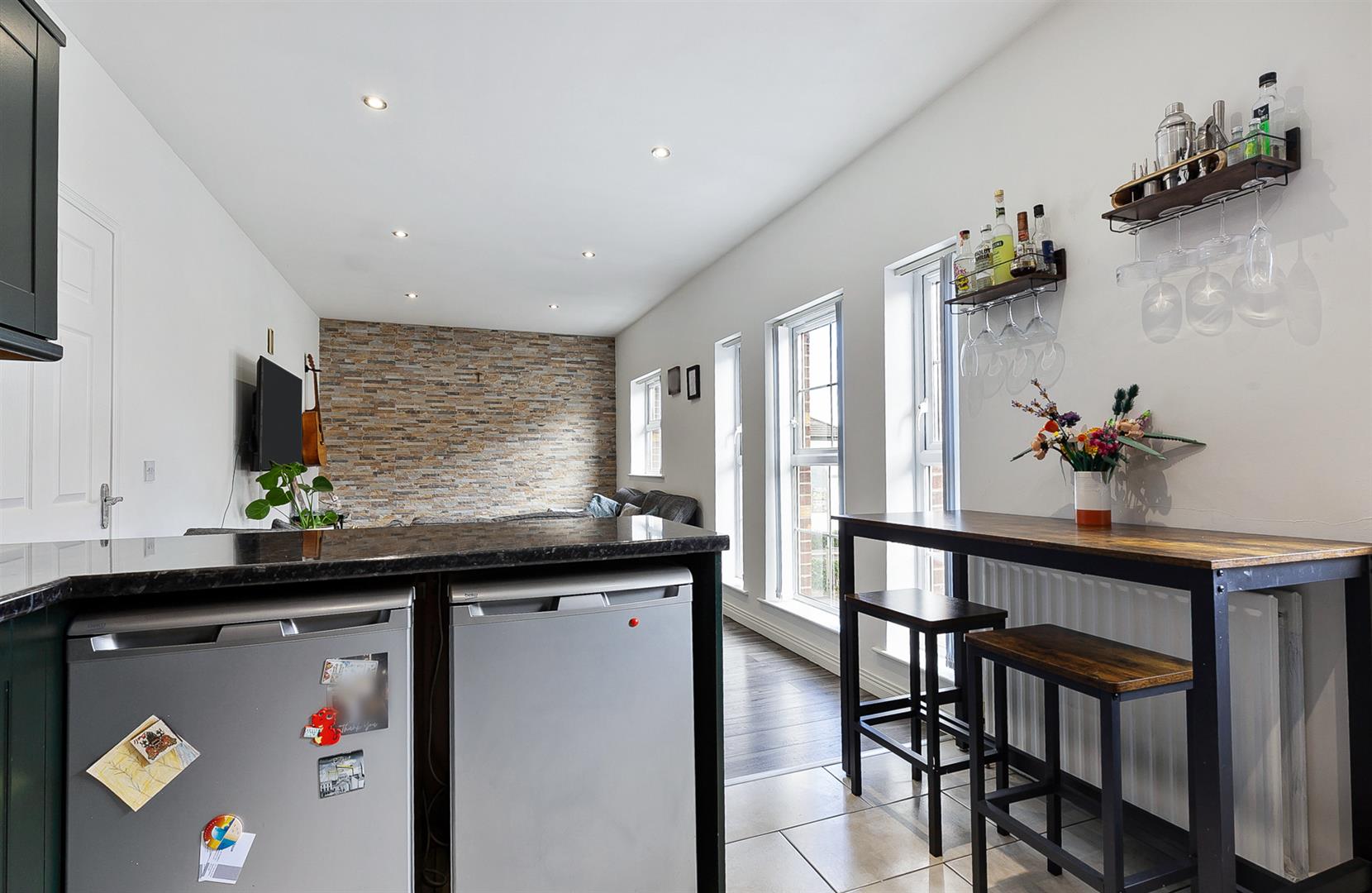 Tiled feature wall. Wood laminate floor covering. Open through to: