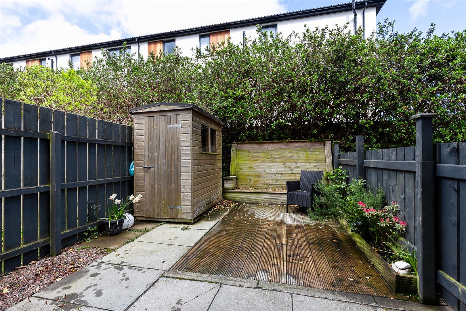 Private garden area finished in timber decking, paving, decorative stone and range of plants and shrubs.