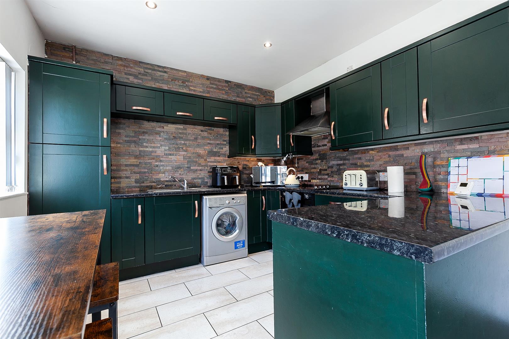 Modern fitted kitchen with range of high and low level storage units with contrasting granite effect melamine work top. Stainless steel sink unit with draining bay. Integrated ceramic hob with stainless steel extractor hood over. Integrated double oven. Space for undercounter fridge and freezer. Gas fired central heating boiler (housed within matching unit). Splashback tiling to walls. Tiled floor.