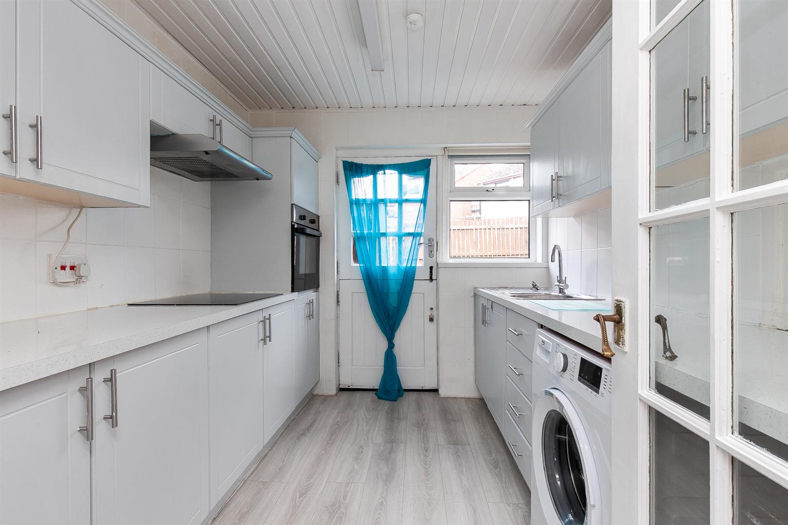 Modern fitted kitchen with range of high and low level storage units with contrasting quartz effect melamine worktop. Stainless steel 1.5 bowl sink unit with draining bay. Integrated touch screen ceramic hob with extractor hood over. Integrated oven. Plumbed and space for washing machine. Space for undercounter fridge. Fully tiled walls. Wood laminate floor covering. Glass panelled stable style door leading to back garden.