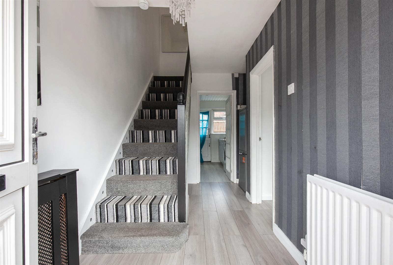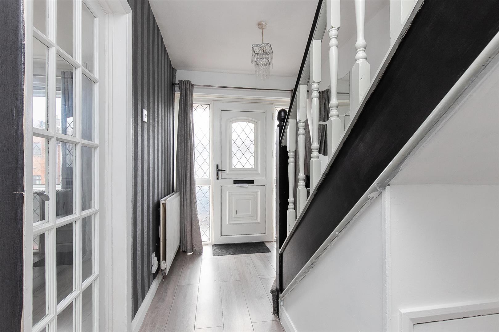 PVC double glazed front door with matching side screens. Wood laminate floor covering. Stairwell to first floor. Access to under stairs store. Glass panelled doors leading to lounge and kitchen.