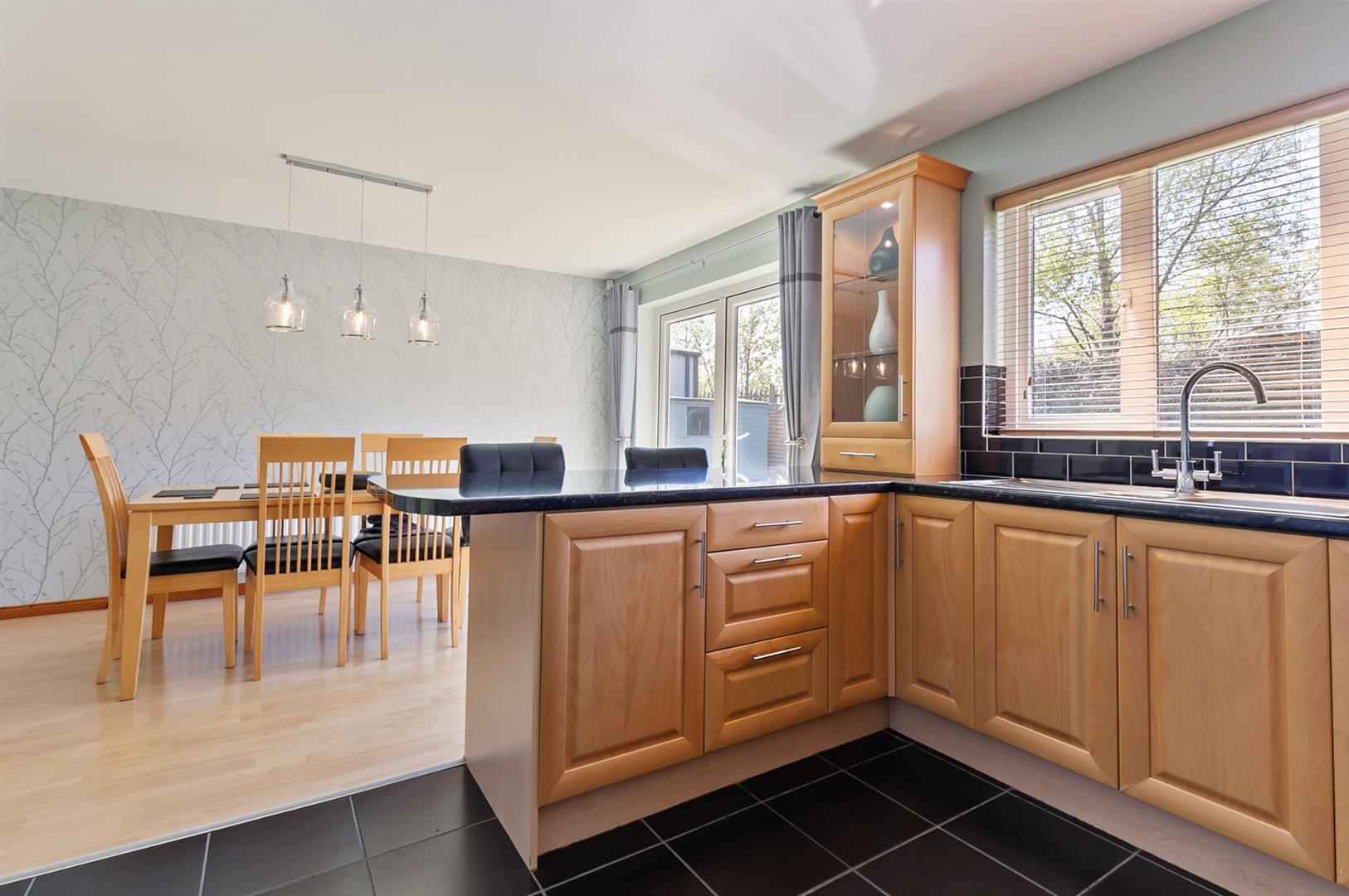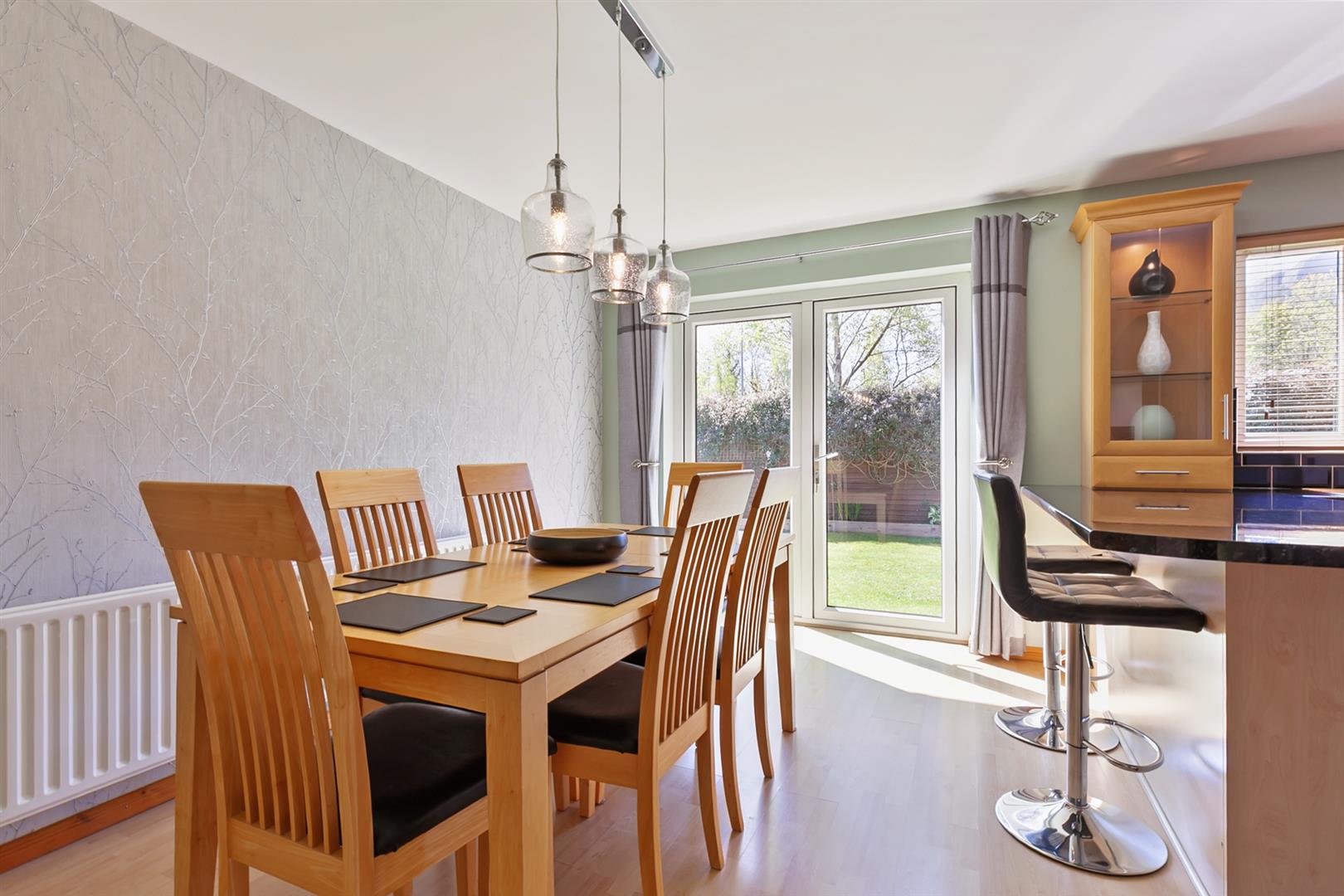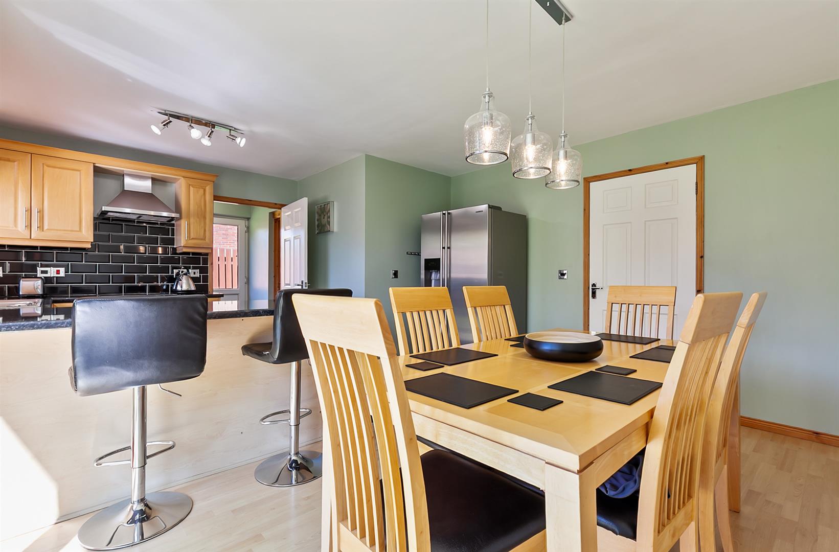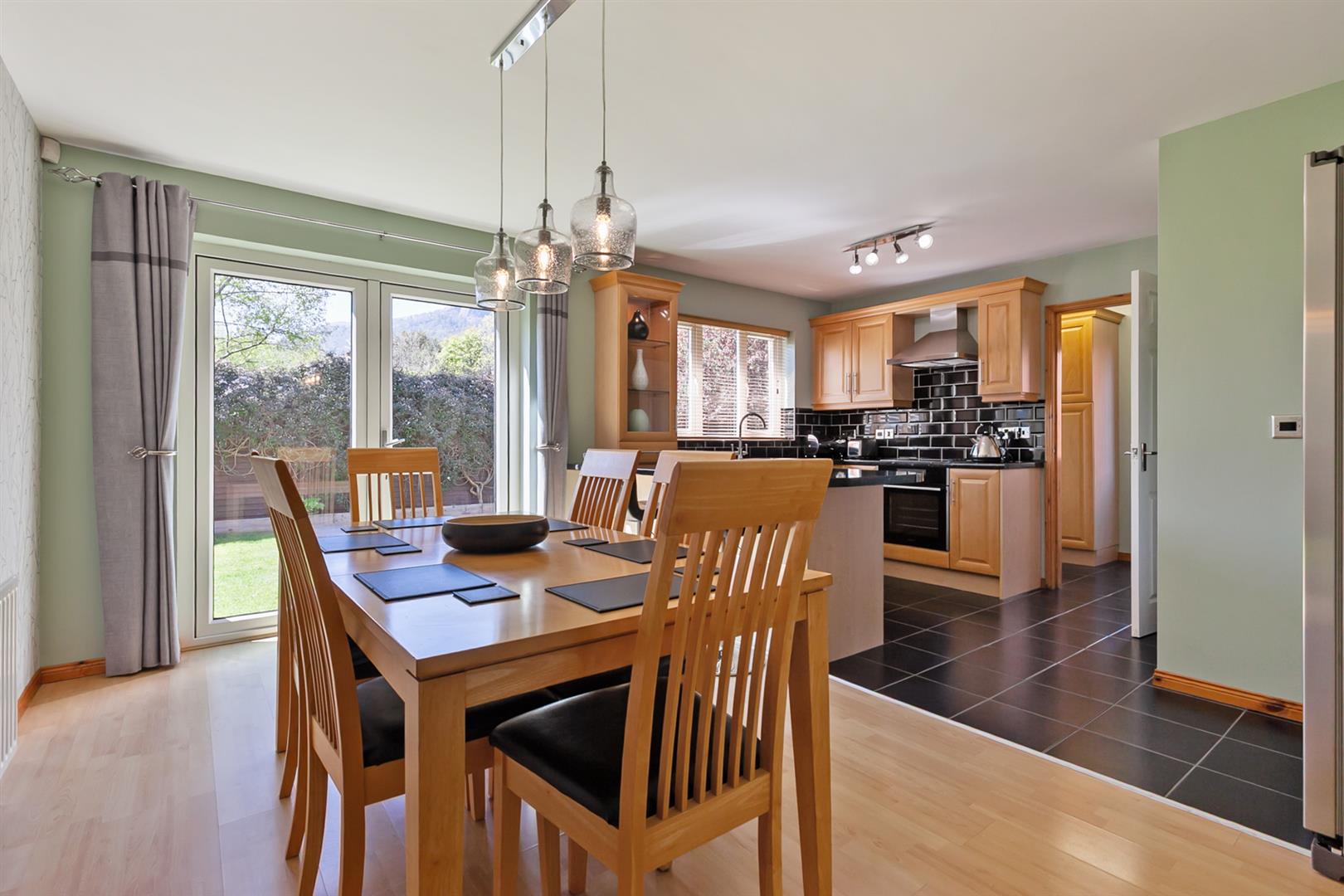 Modern fitted kitchen with range of high and low level storage units with granite effect melamine work surface. Stainless steel 1.5 bowl sink unit with draining bay. Integrated ceramic hob with stainless steel extractor hood over. Integrated oven. Space for American style fridge freezer. Splashback tiling to walls. Glass fronted display cabinet. Tiled floor to kitchen. Wood laminate floor covering to dining area. PVC double glazed French doors leading rear garden. View towards Cave Hill.