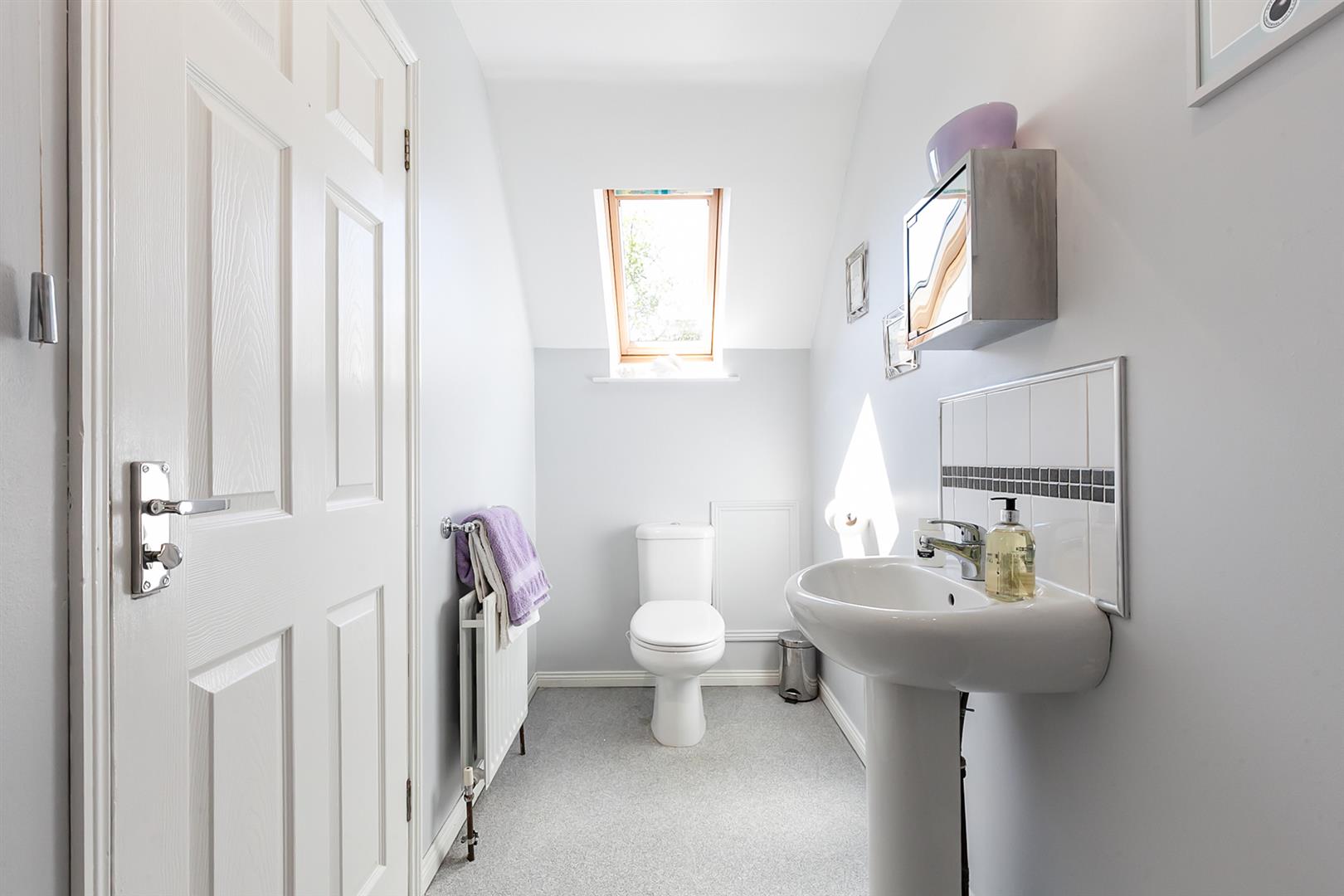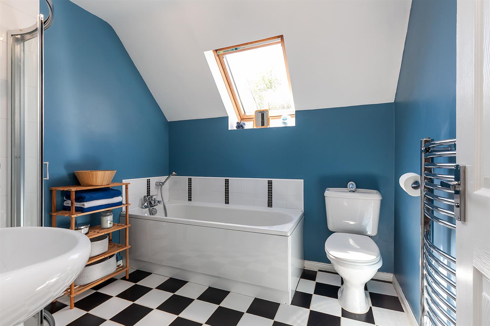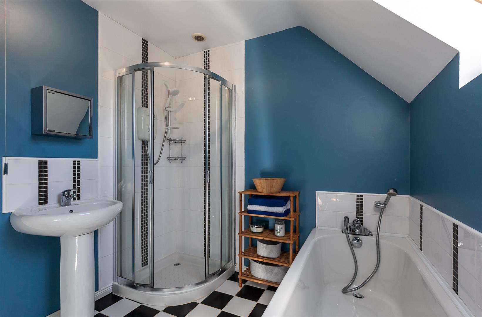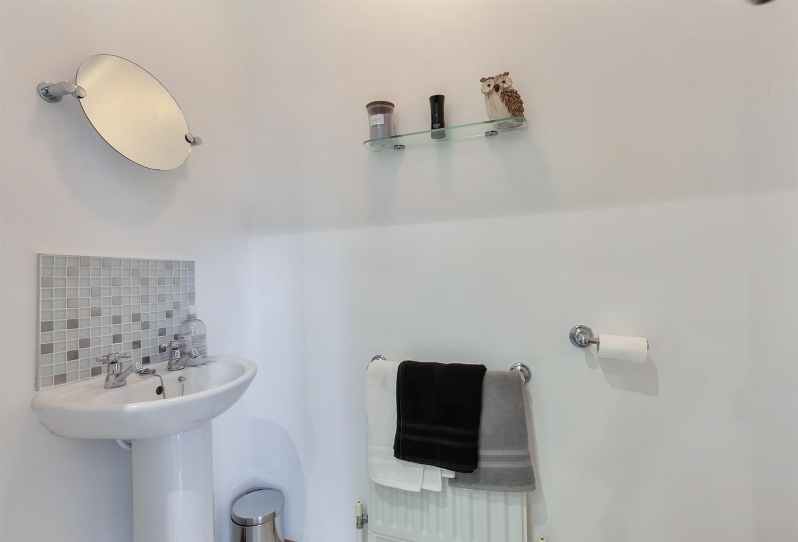 White, four piece suite comprising panelled bath, separate fully tiled shower enclosure, pedestal wash hand basin and WC. Electric shower. Part tiling to walls. Chrome towel radiator. Tiled floor.