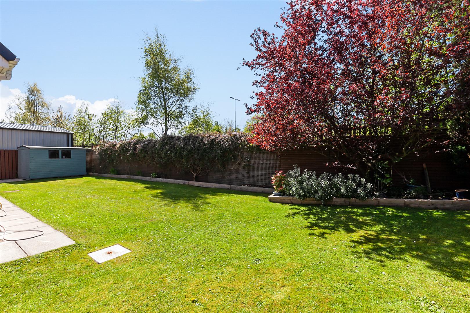 Fully enclosed rear garden finished in lawn, raised beds, paving and range of plants, trees and shrubbery.