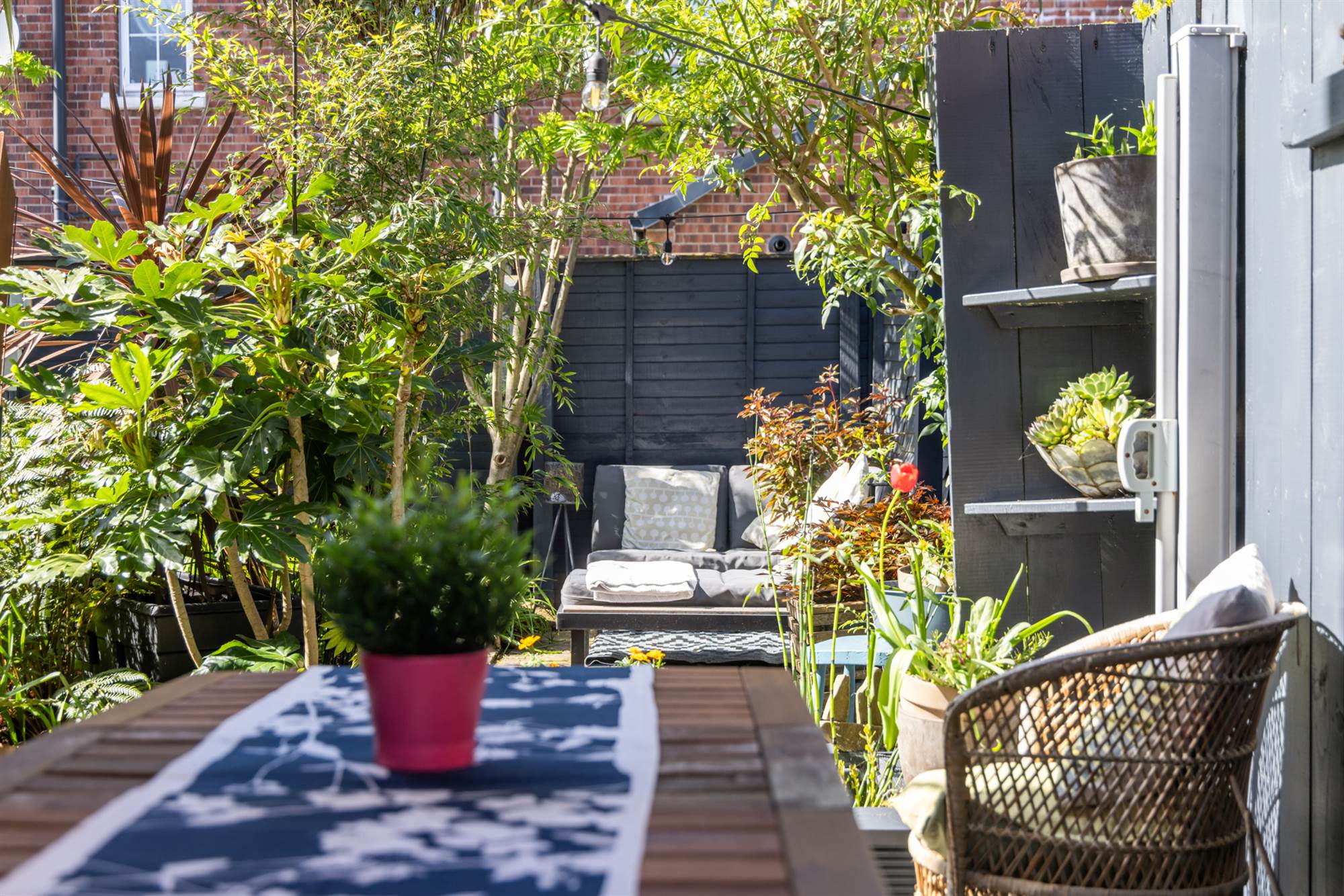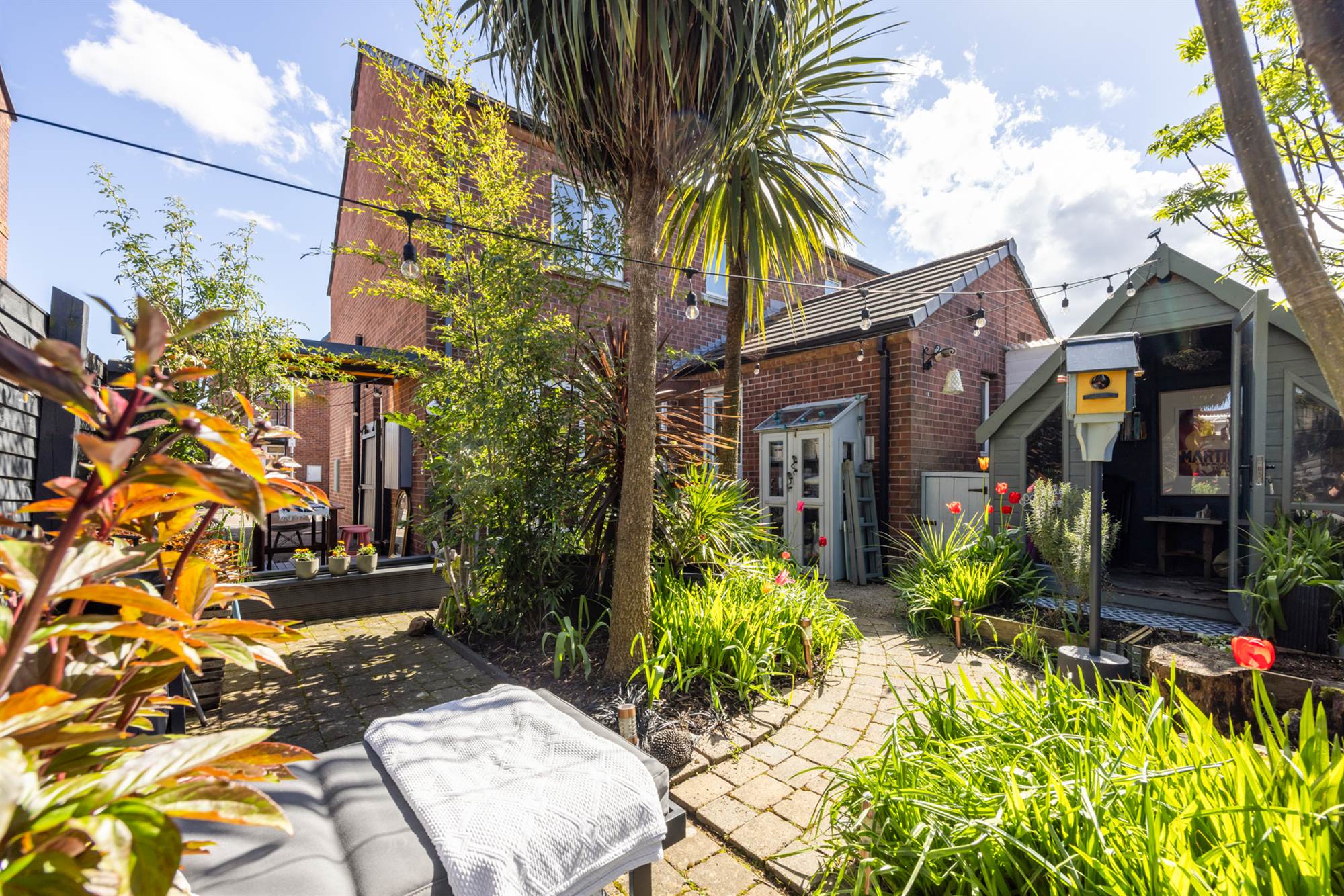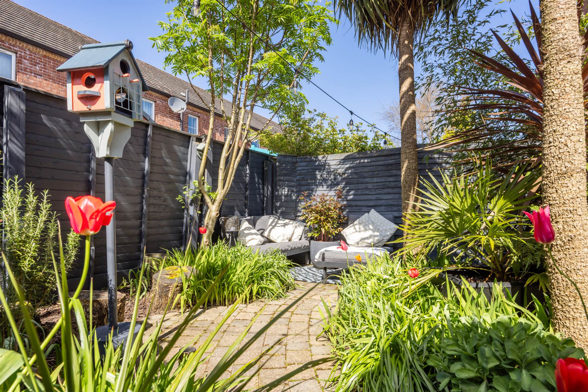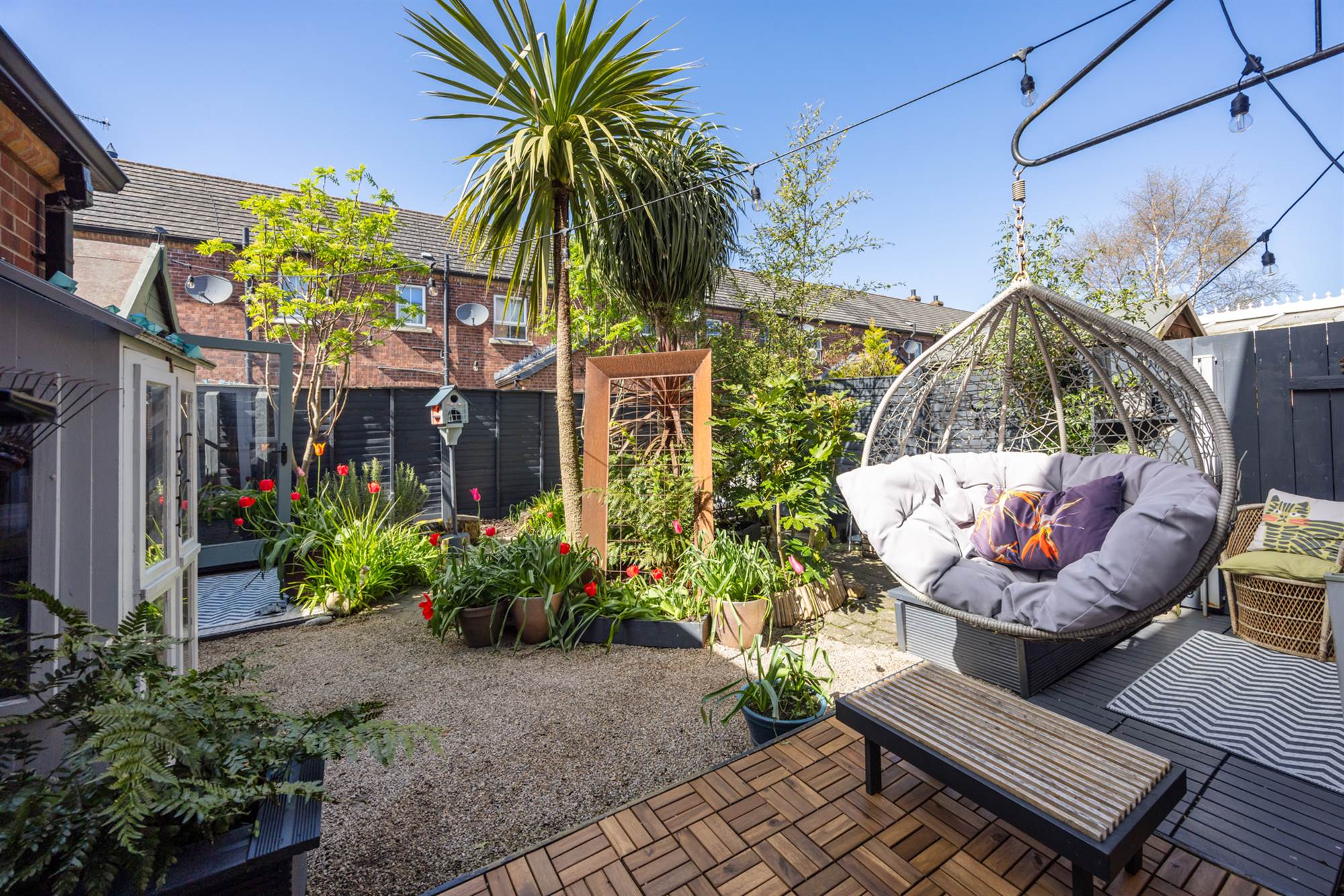 West-facing. Excellent range of mature plants, trees and shrubs. Pavior patio areas and parquet-style deck.