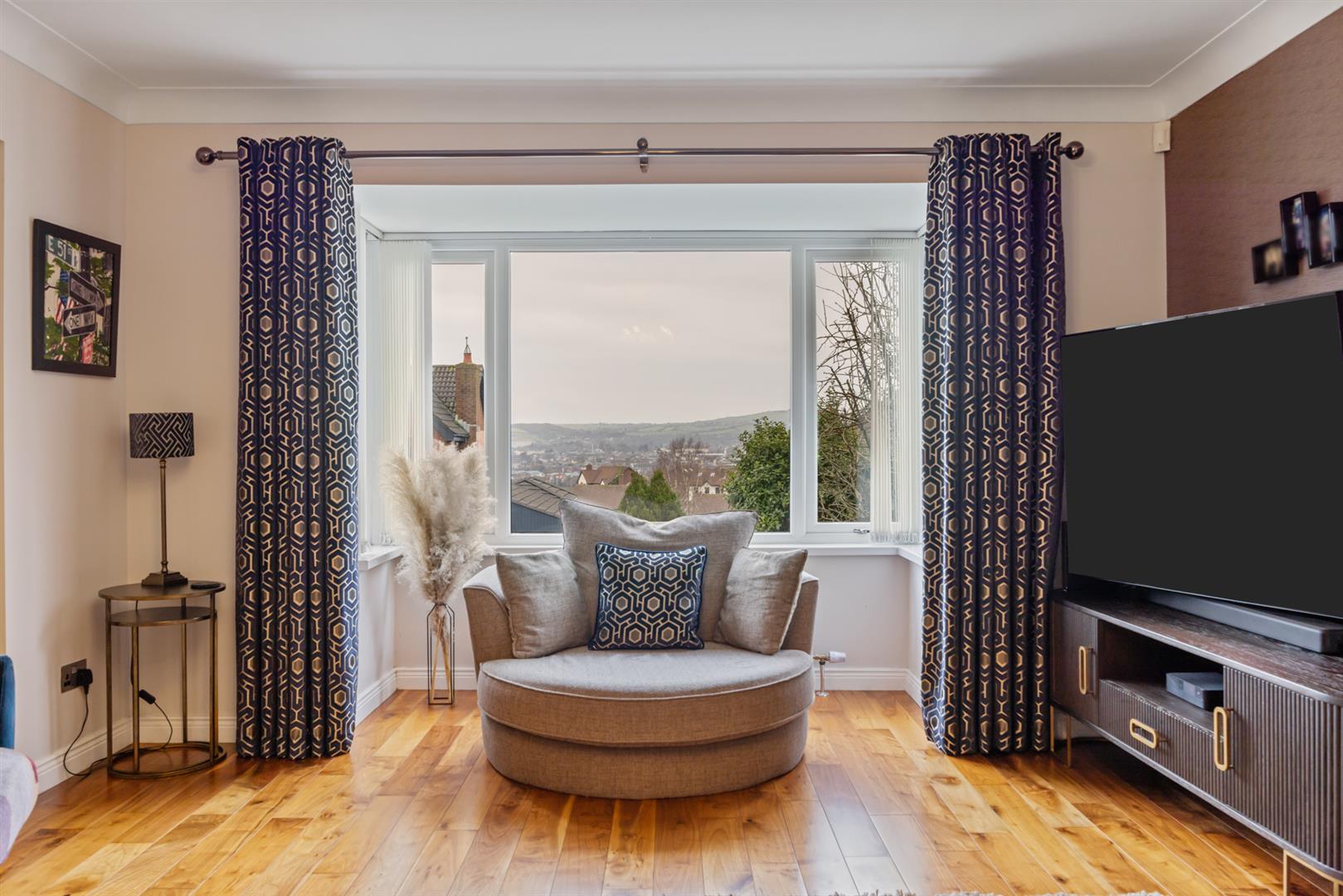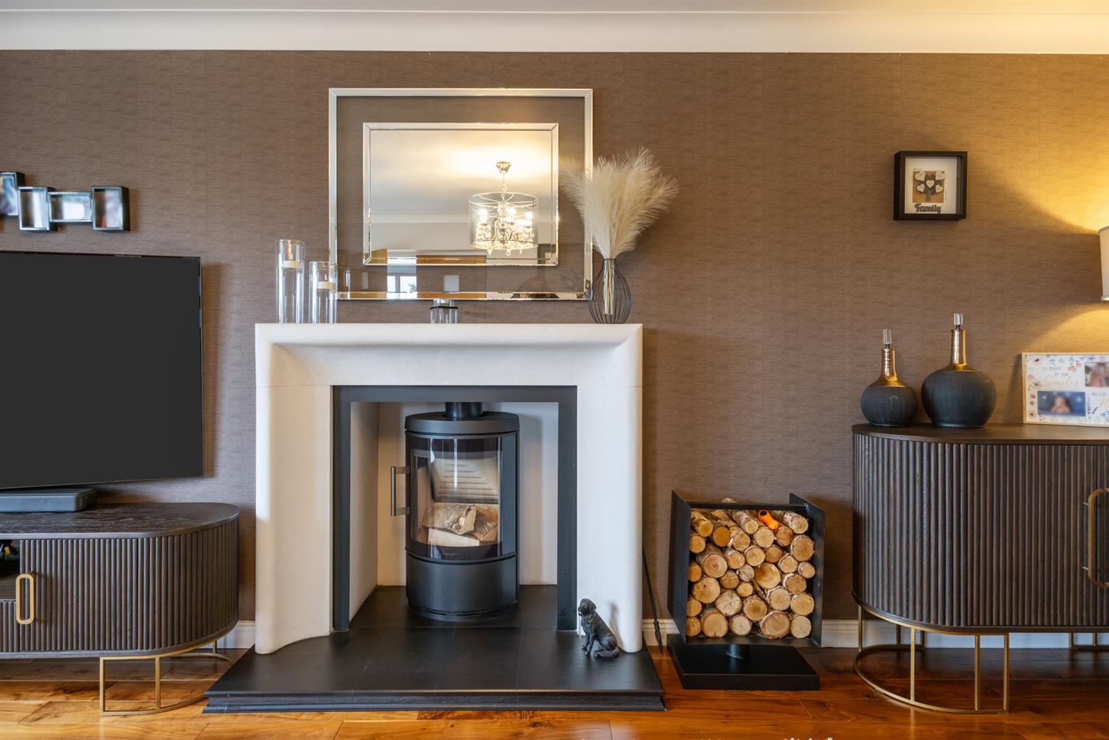 Walnut hardwood floor, inglenook style fireplace with slate hearth, limestone surround and wood burning stove, cornicing, views over Newtownards.