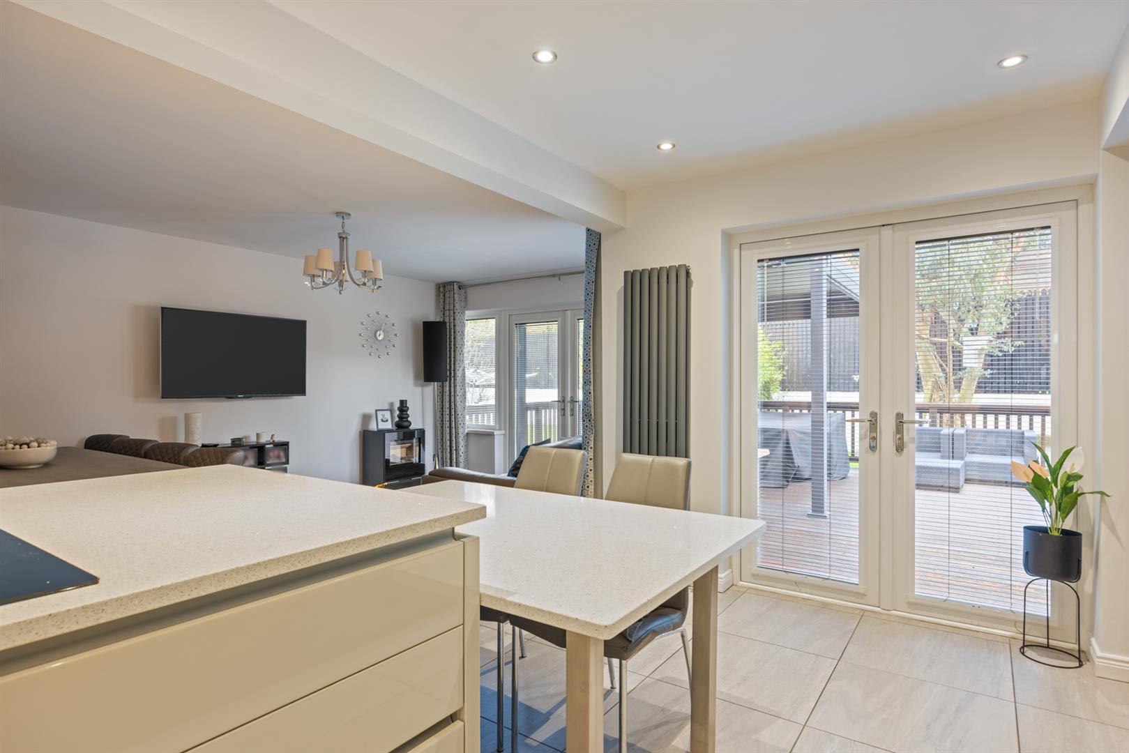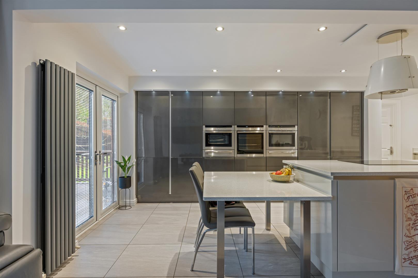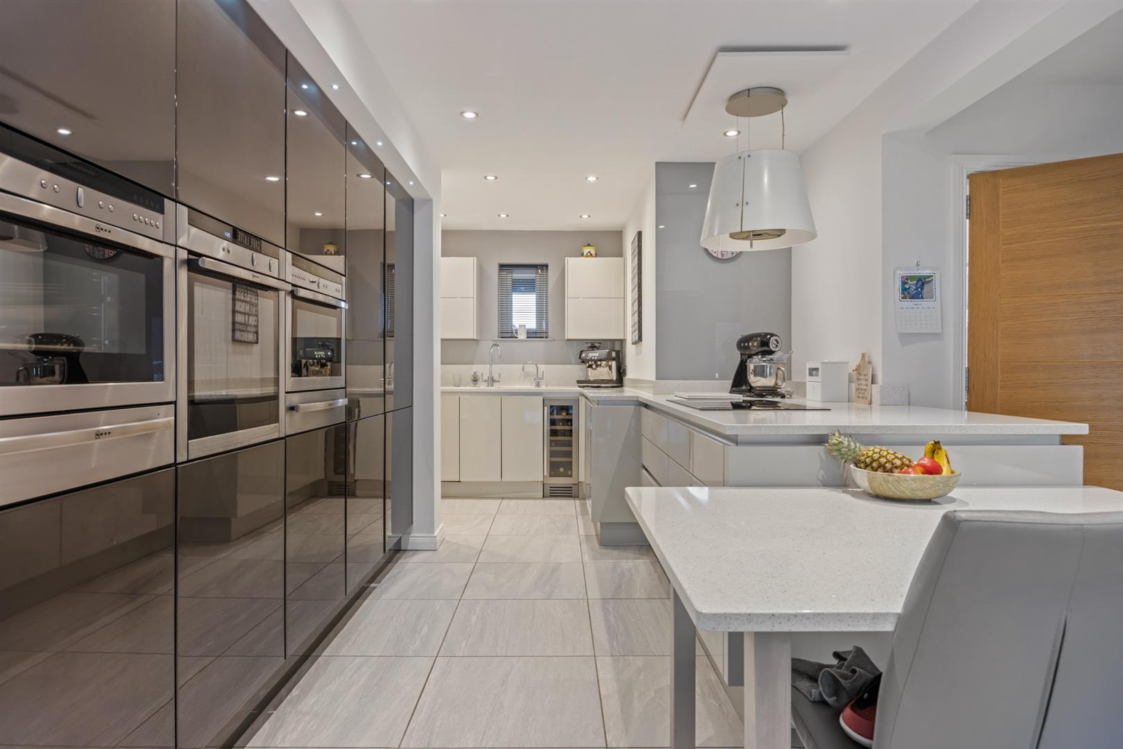 Luxury range of high and low level units, quartz work surfaces and upstands, "Neff" induction hob with overhead feature extraction unit, built in wine cooler, one and a quarter stainless steel sink with built in drainer and mixer tap, integrated double fridge, integrated freezer, built in "Neff" oven, built in "Neff" steam oven with warming drawer, built in "Neff" microwave with warming drawer, integrated dishwasher, feature spot lighting, informal dining, access to integral garage, double doors to raised decked entertaining area.