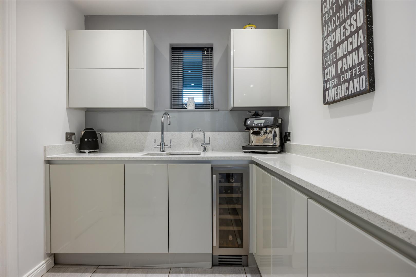 The luxury kitchen has a fantastic range of units with quartz work surfaces, a range of "Neff" built in appliances, hot tap, access to an integral garage, space for informal dining and is open to a large family area with gas stove. Both of these areas have access to the rear garden via double doors.
