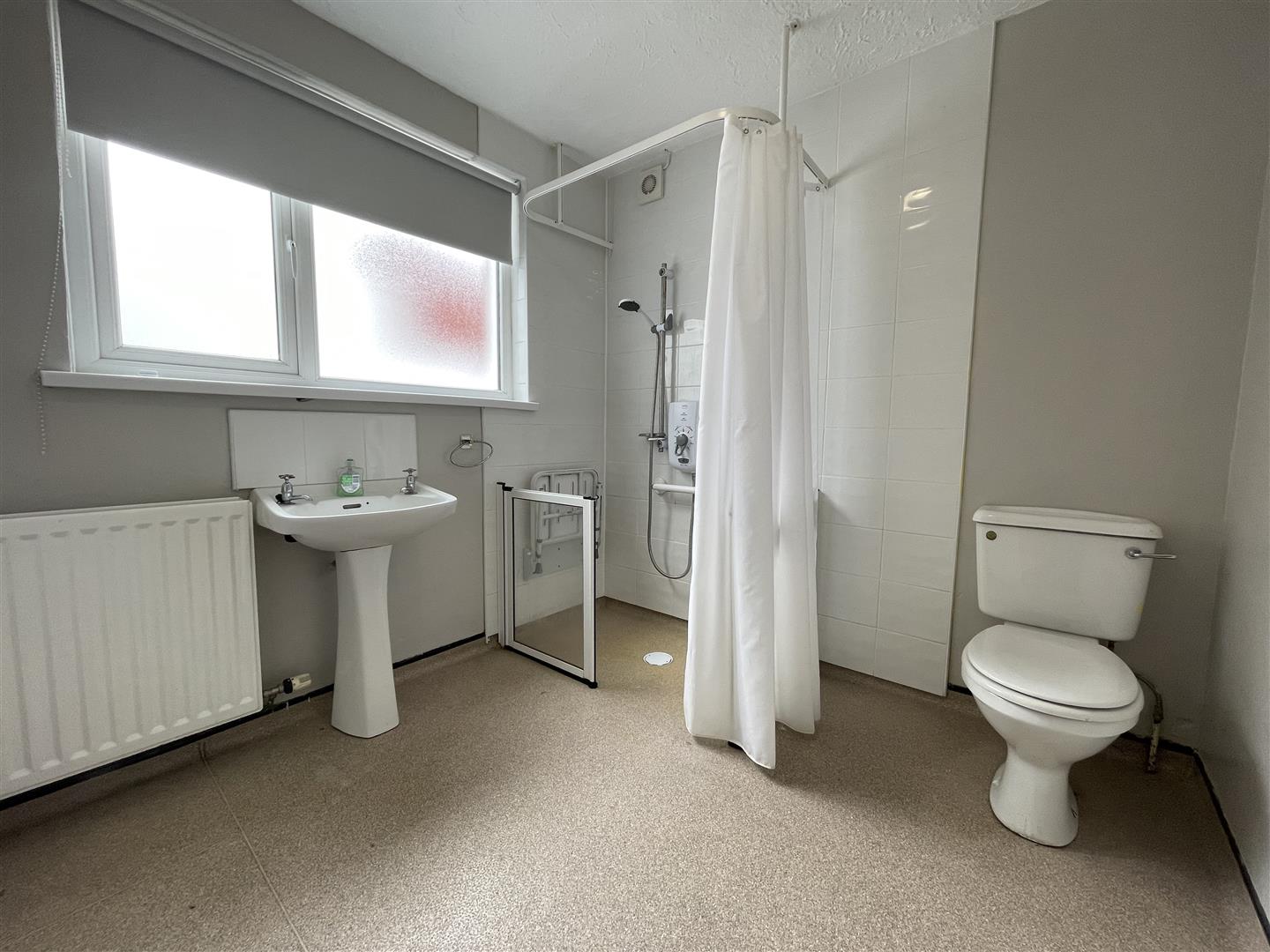 White suite comprising, walk in shower, wall mounted overhead shower, pedestal wash hand basin with mixer tap, low flush w/c, extractor fan, partially tiled walls.
