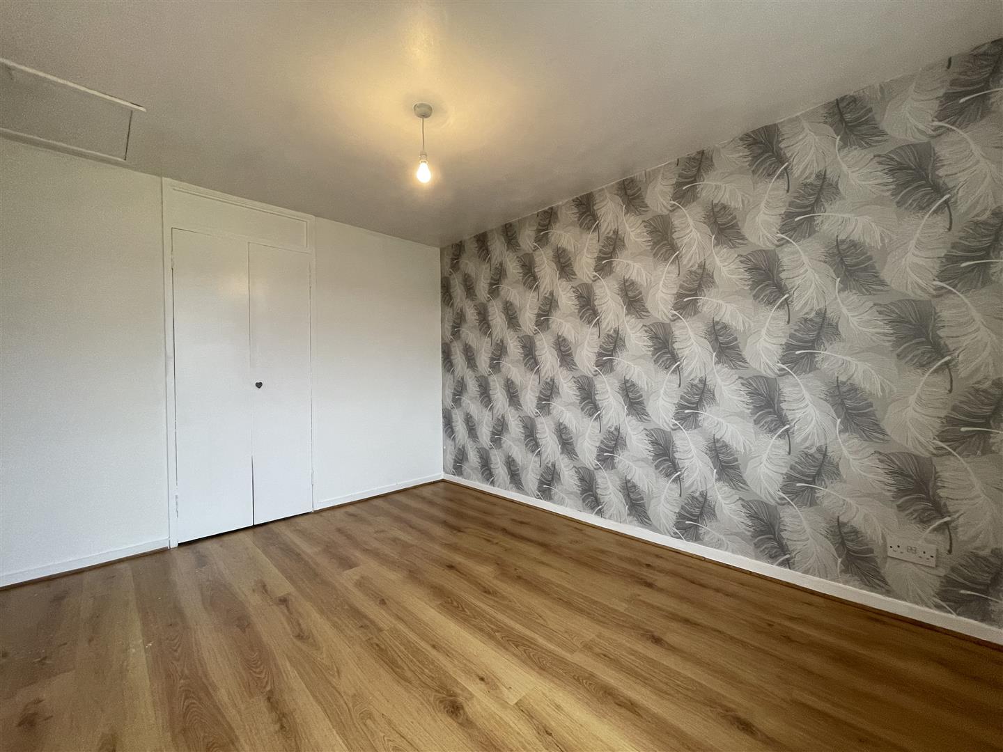 Double bedroom with built in storage and wood laminate flooring.
