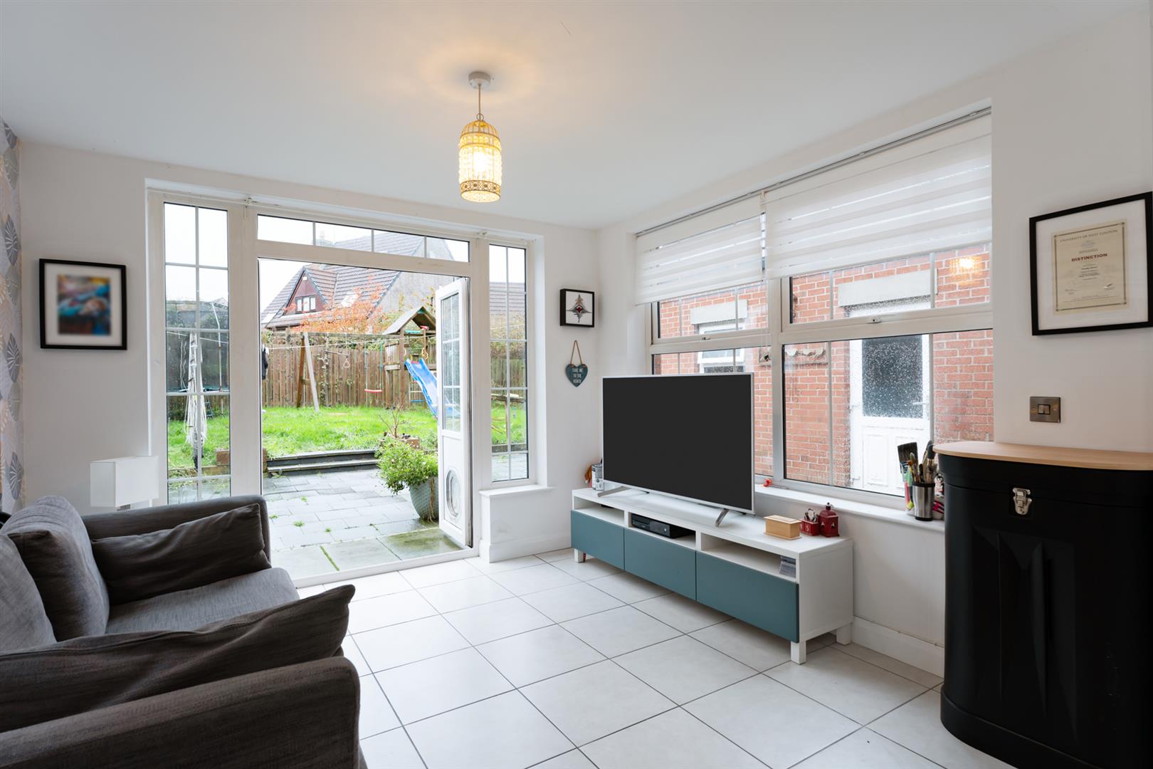 Ceramic tiled floor. Patio doors to garden.