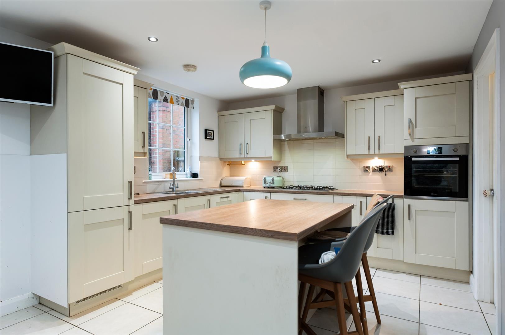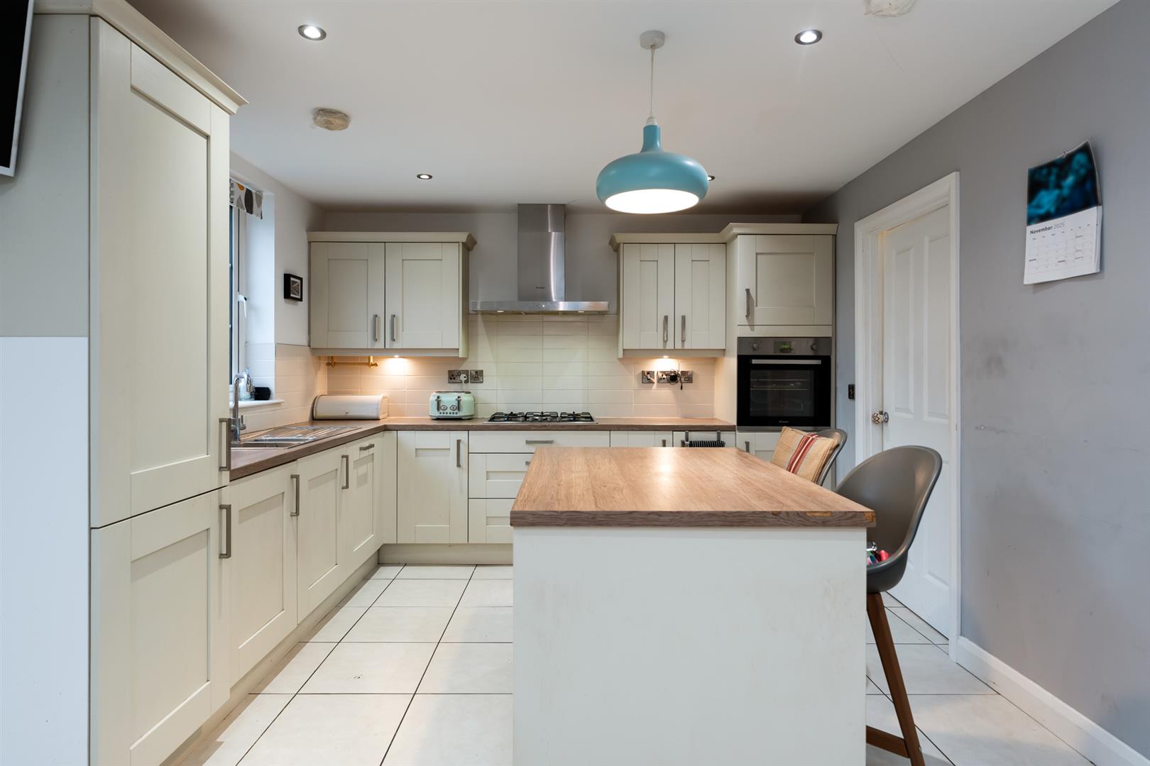 Excellent range of high and low level units with wood effect work surfaces, inset one and a quarter bowl stainless steel sink unit with mixer taps, integrated appliances to include; mid-level oven, five ring gas hob, stainless steel extractor hood, fridge freezer and dishwasher, breakfast island with seating, partly tiled walls, ceramic tiled floor, recessed spotlighting and open to dining area.