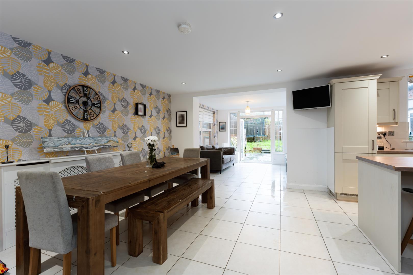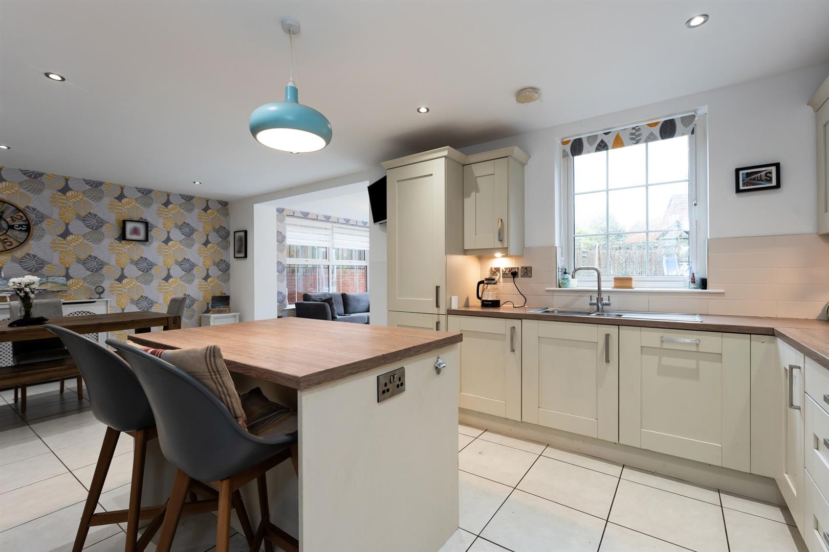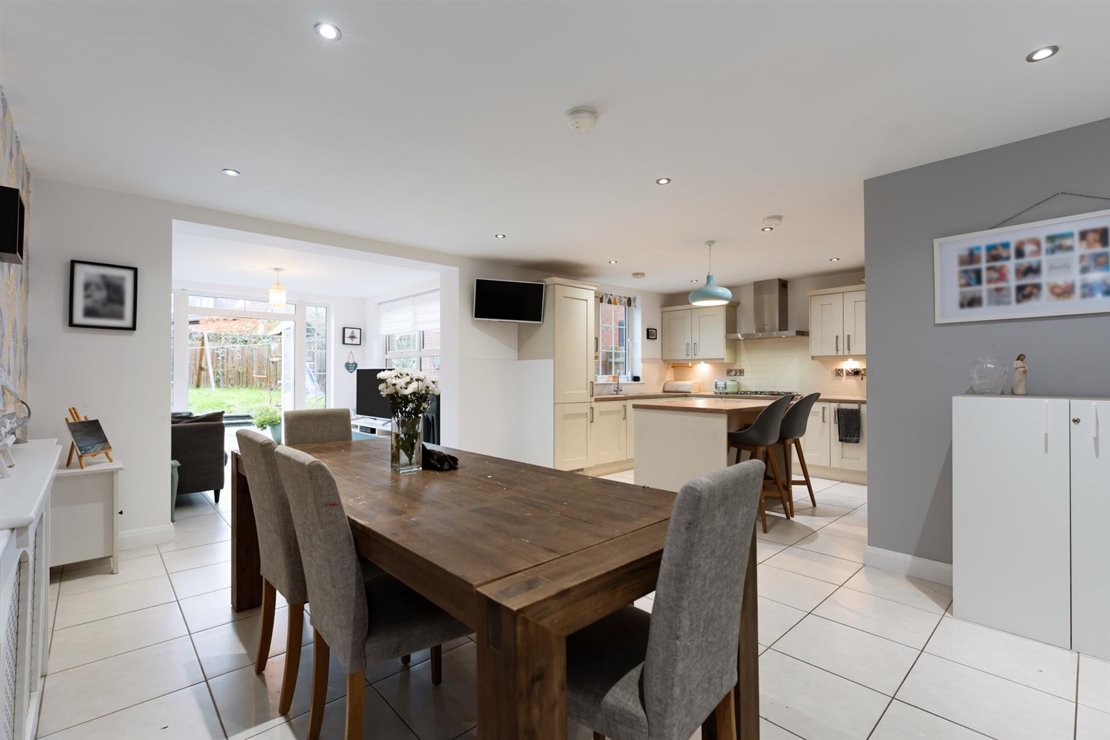 The spacious kitchen and dining area includes a range of high and low-level units with wood-effect worktops, integrated appliances, a breakfast island, and ceramic tiled floor. An archway opens to the sunroom with patio doors leading to the rear garden, making it ideal for family life and entertaining. A separate utility room provides extra storage and laundry space.