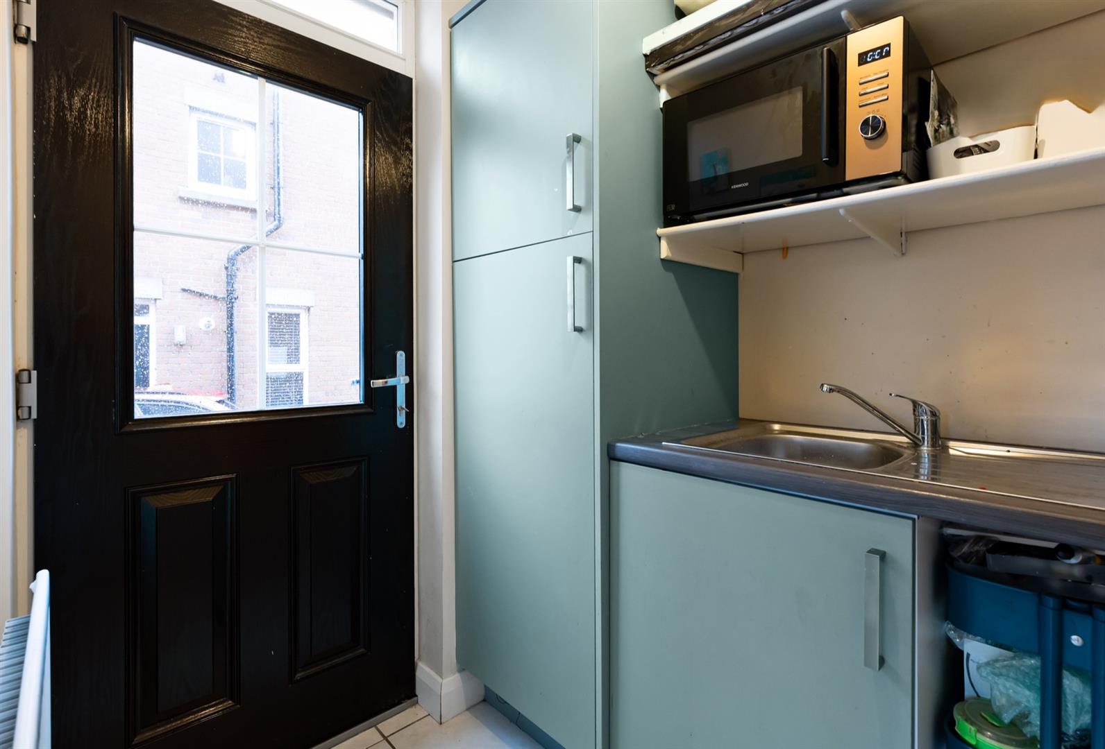 Range of high and low level units with wood effect work surfaces, inset single drainer stainless steel sink unit with mixer taps, enclosed gas fired boiler, door to wash area which is plumbed for washing machine, ceramic tiled floor.