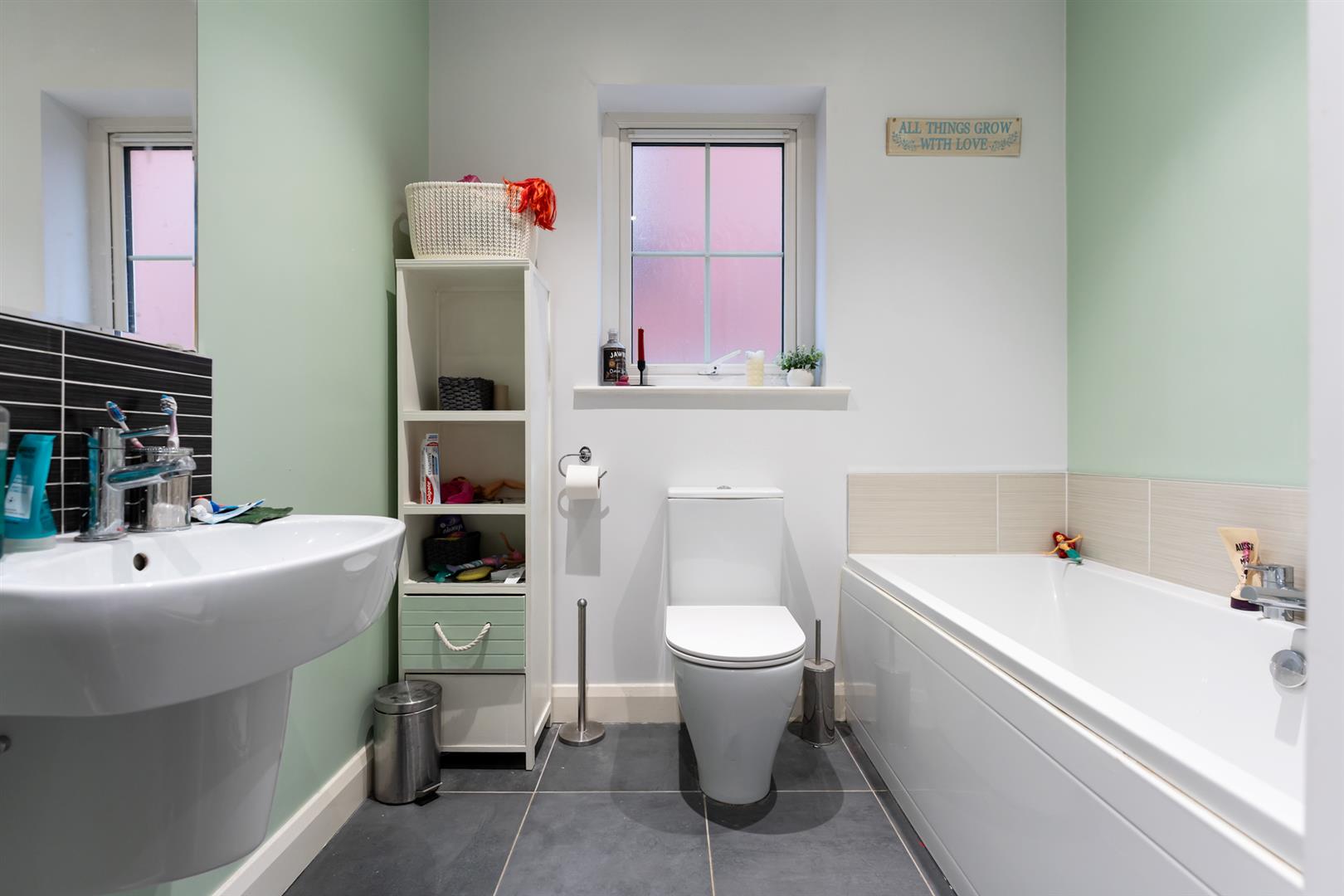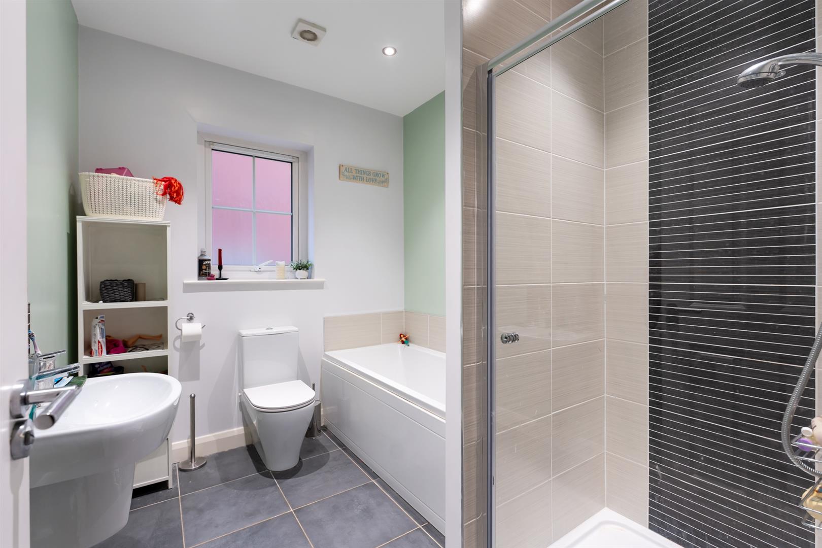 Upstairs are four good-sized bedrooms, including a main bedroom with ensuite shower room. The family bathroom features a bath and separate shower cubicle, both finished with modern tiling and chrome fittings.