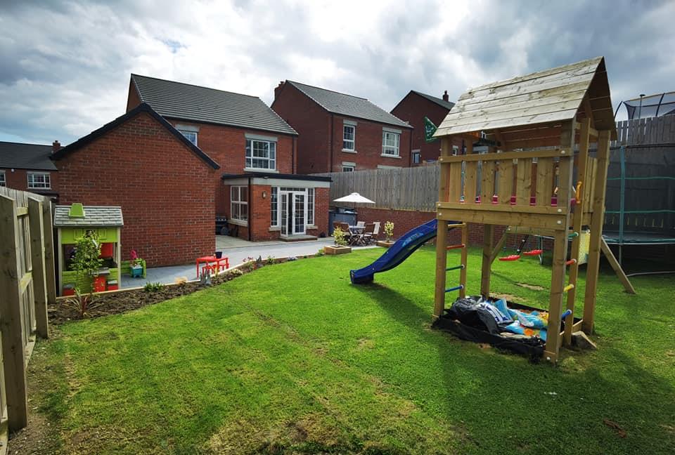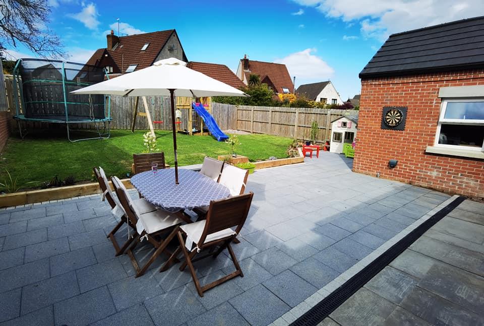 Enclosed rear garden with large patio leading to good sized area in lawn with flowerbeds and timber fence, outside tap and sockets.