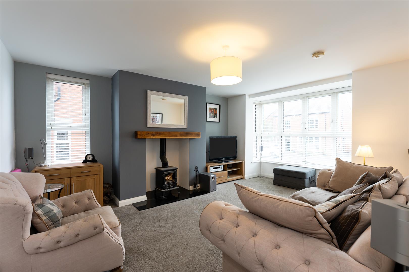 Dual aspect with feature Bay window. Wood burning stove with granite hearth and wooden mantel beam.