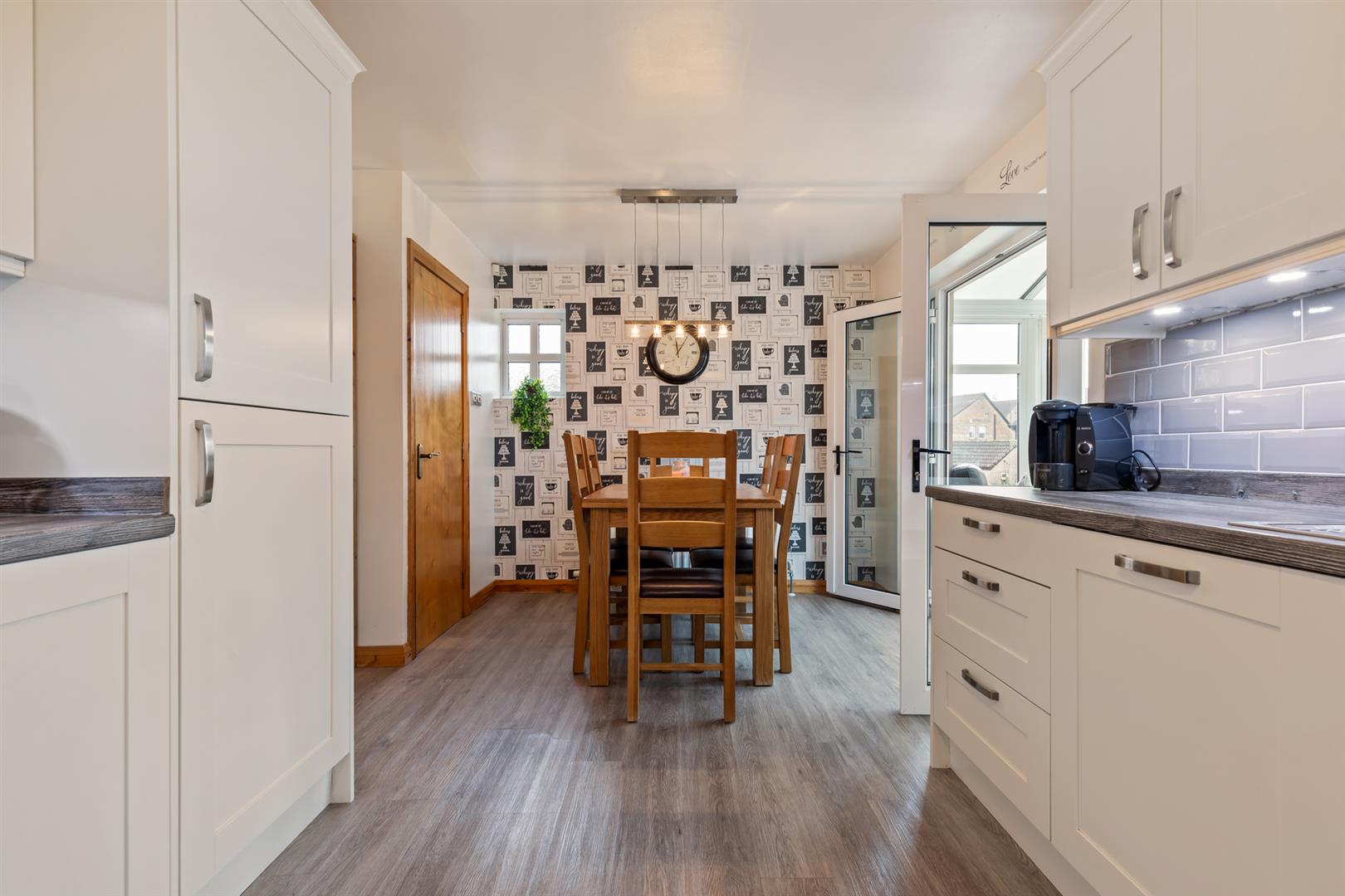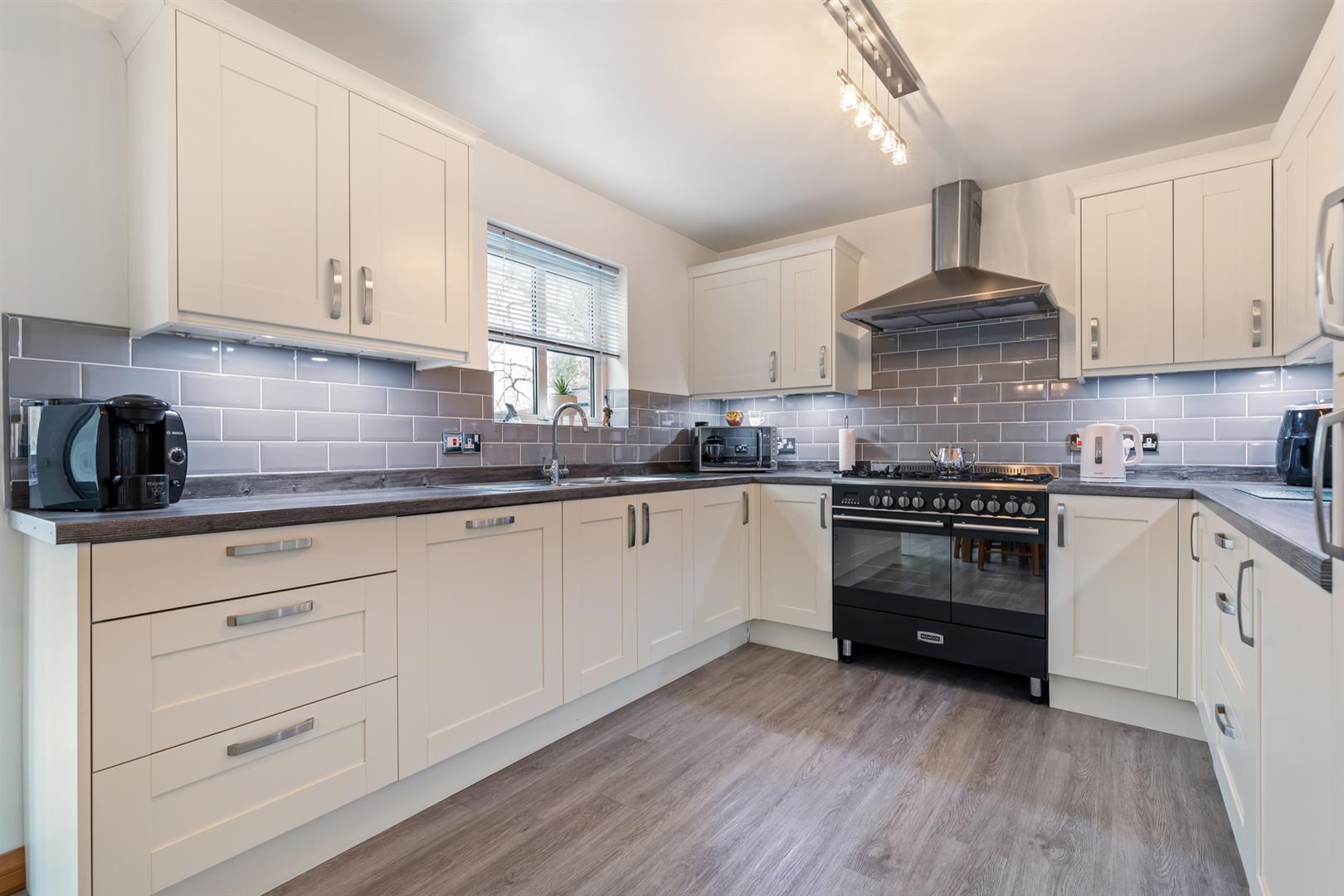 Excellent range of high and low level units with laminate wood effect work surfaces with matching upstand, inset 1 & 1/4 drainer stainless steel sink unit with mixer tap. Space for range cooker, stainless steel extractor fan, integrated fridge freezer, integrated dishwasher, part tiled walls, wood effect SPC flooring.