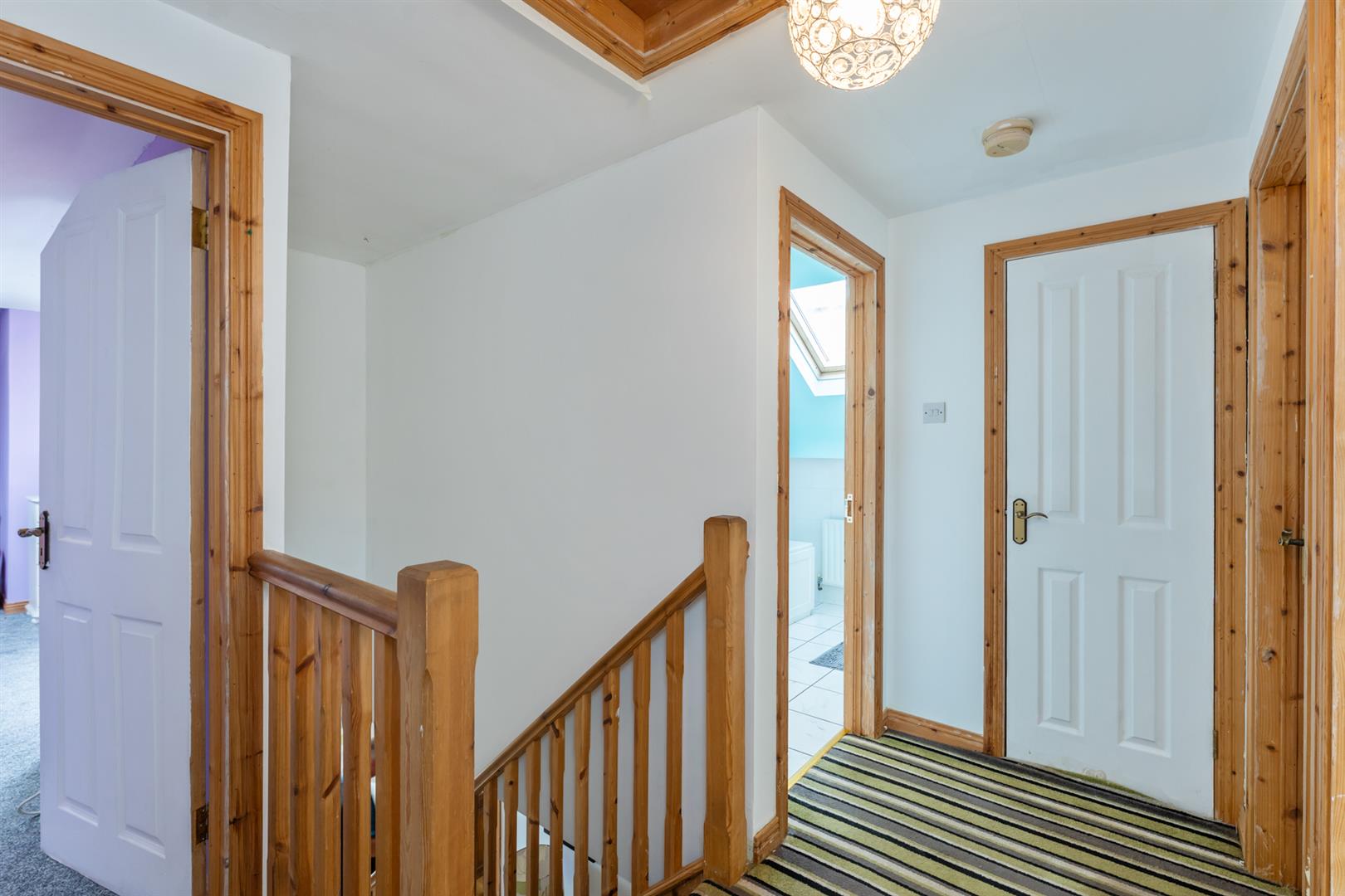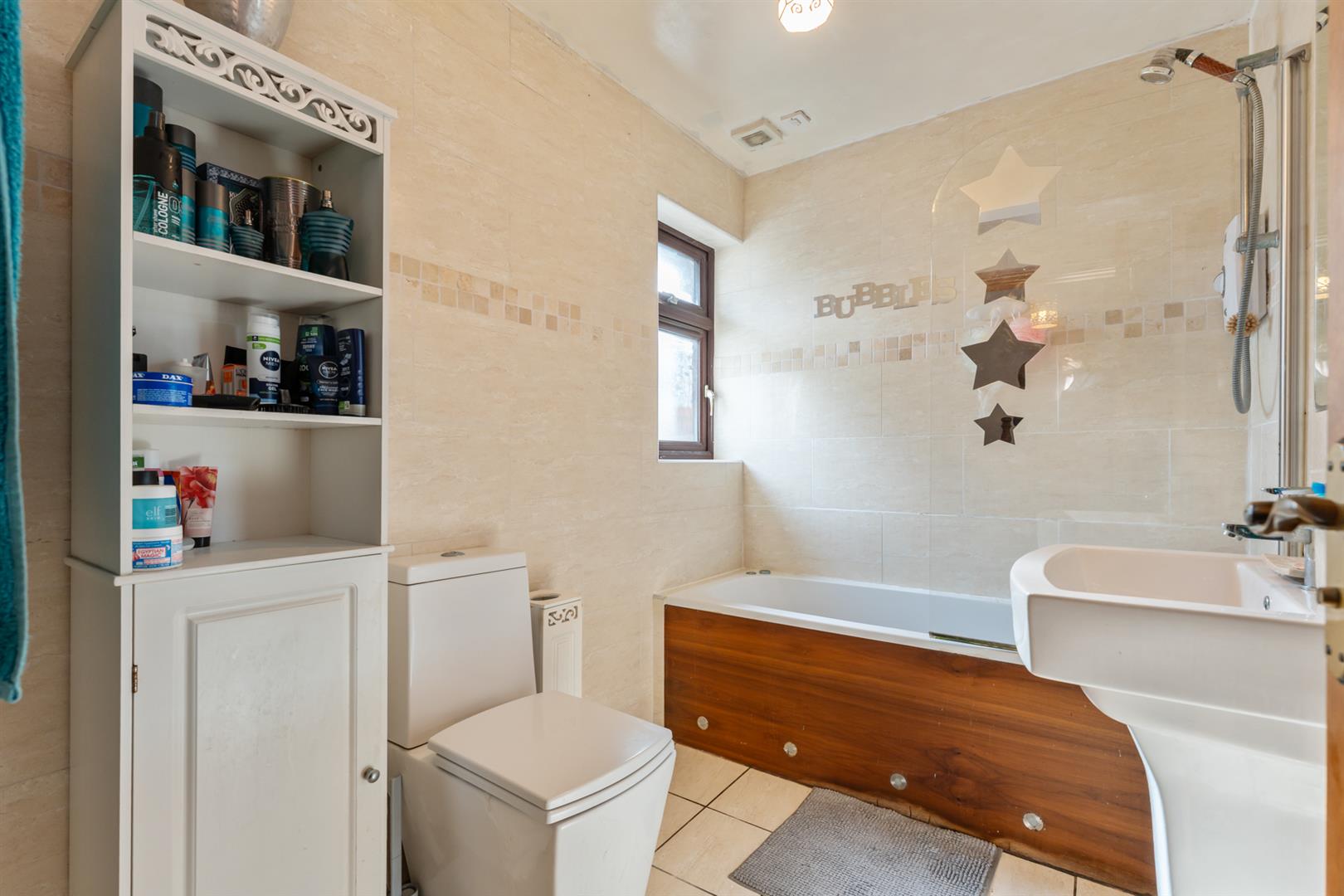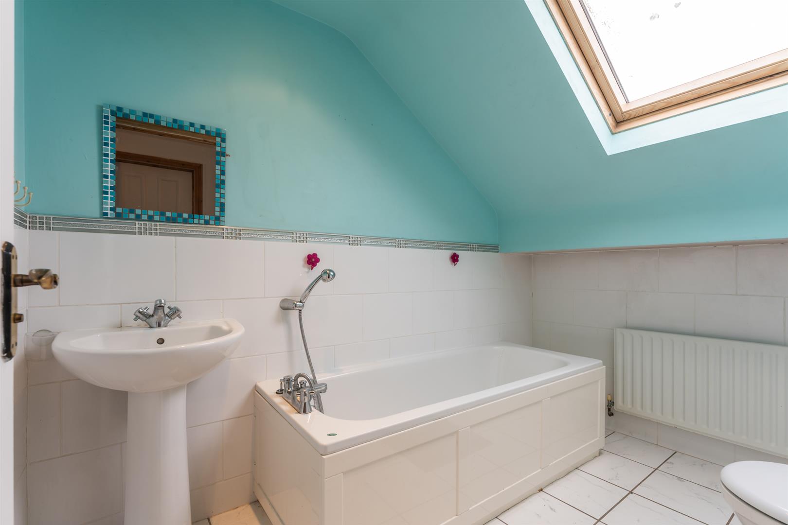 White suite comprising, paneled bath with mixer tap and shower attachment, pedestal wash hand basin with mixer tap, low flush w/c, velux style window, tiled floor, part tiled walls, extractor fan, recessed spotlights.