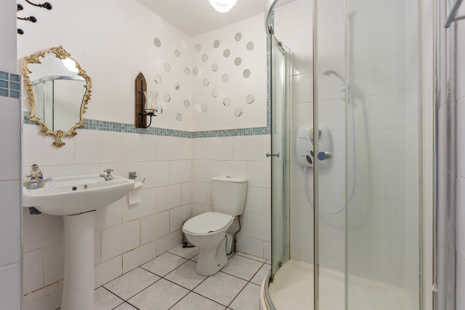 White suite comprising, corner shower enclosure, wall mounted overhead shower, sliding glass doors, pedestal wash hand basin with mixer tap, low flush w/c, tiled floor, part tiled walls, extractor fan.