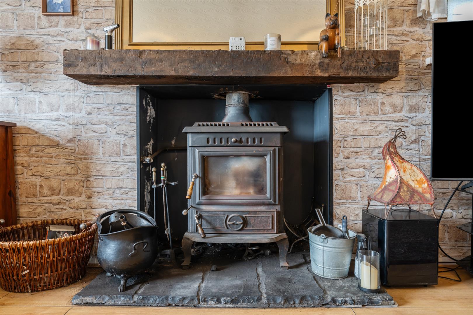 Wood laminate flooring, multi fuel stove with baxi boiler, tiled hearth and wooden mantle.