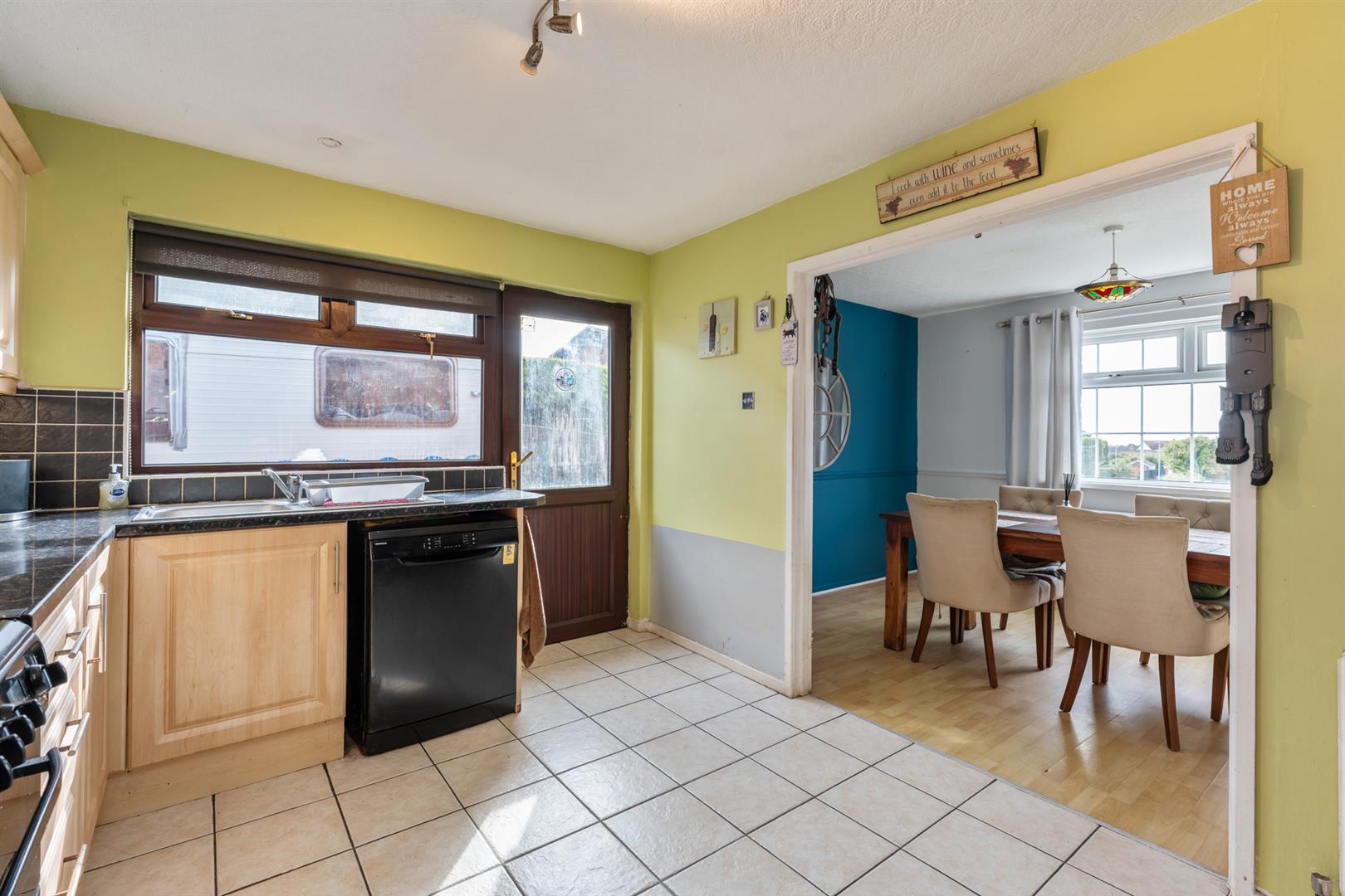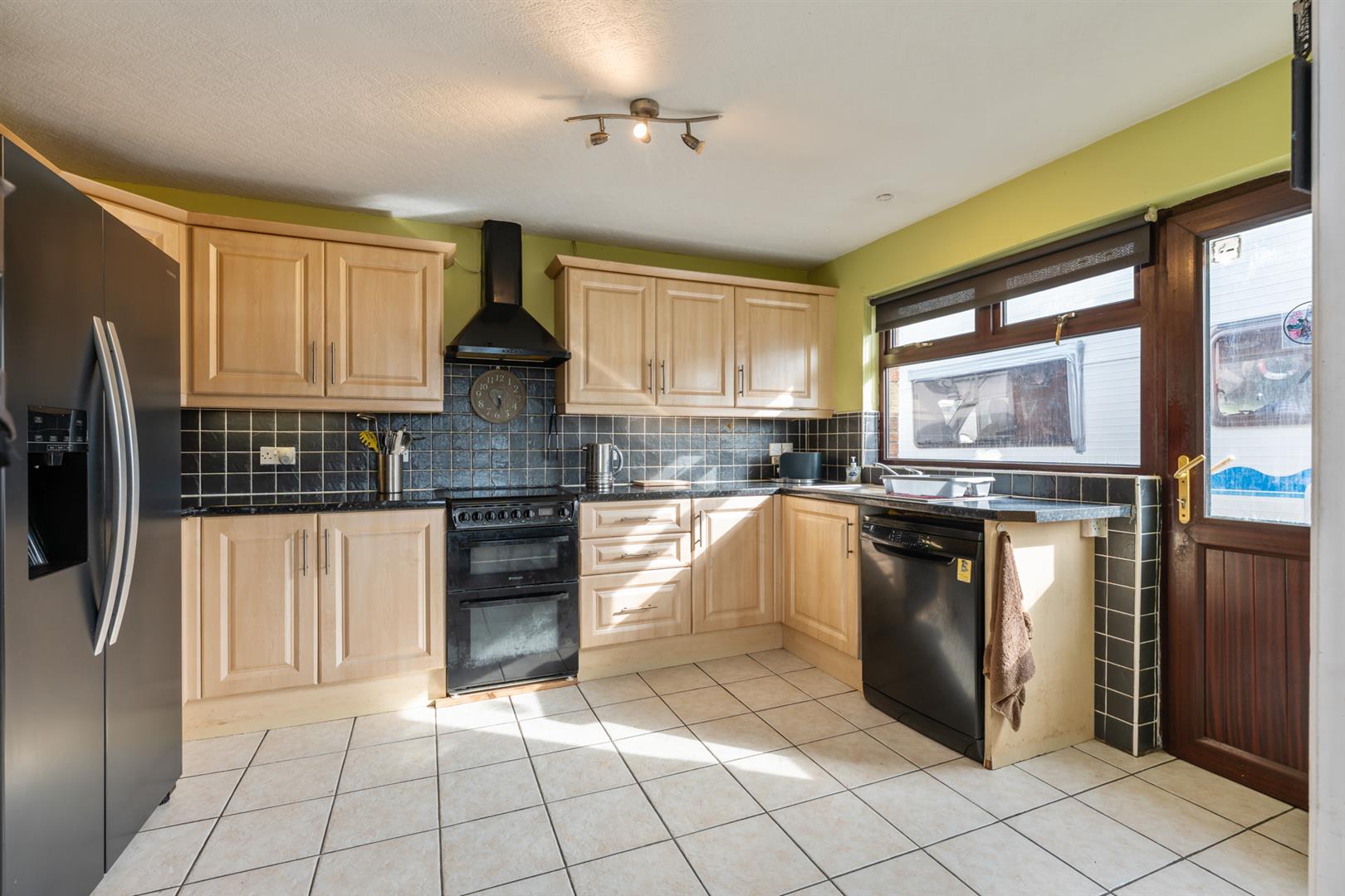 Range of high and low level units, laminate work surfaces, single stainless steel sink with mixer tap and drainer, plumbed for dishwasher, plumbed for American fridge/freezer, space for cooker, black extractor hood, partially tiled walls, tiled floor, back door to enclosed rear garden.