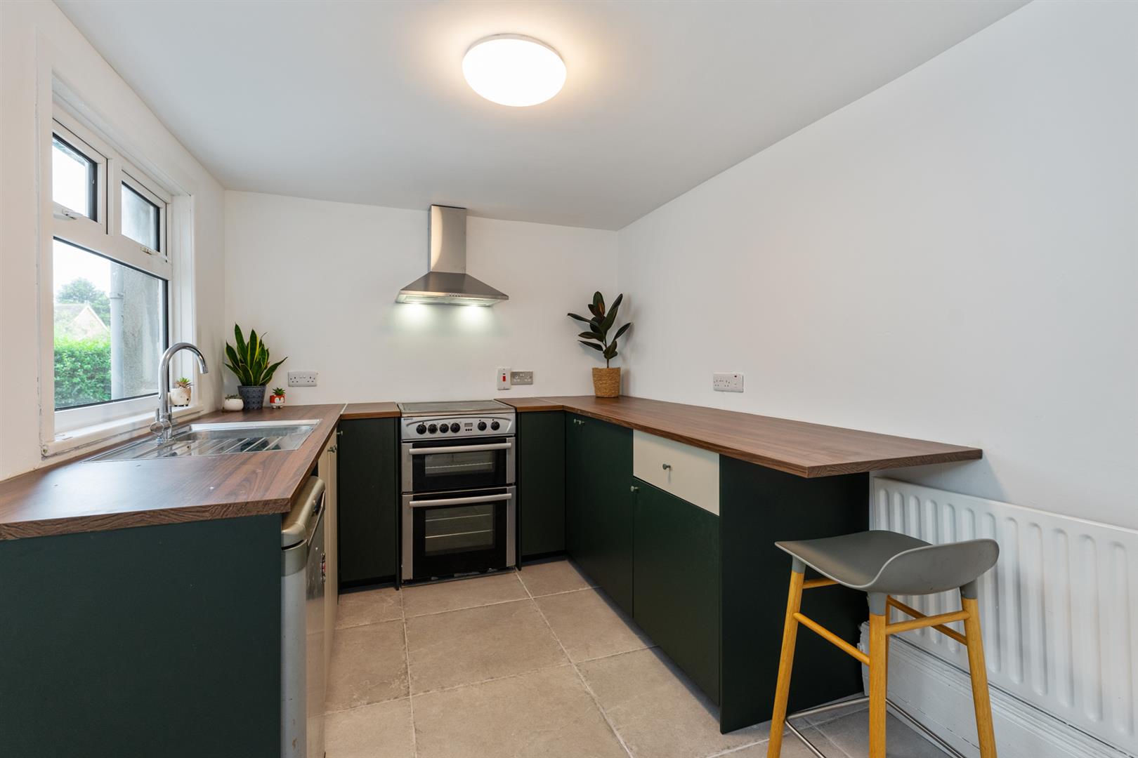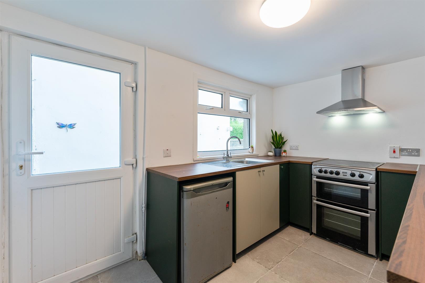 Modern range of low level units with laminate work surfaces, stainless steel sink unit with mixer tap and built in drainer, stainless steel extractor hood and fan, space for oven, plumbed for washing machine and space for fridge/freezer, tiled flooring.