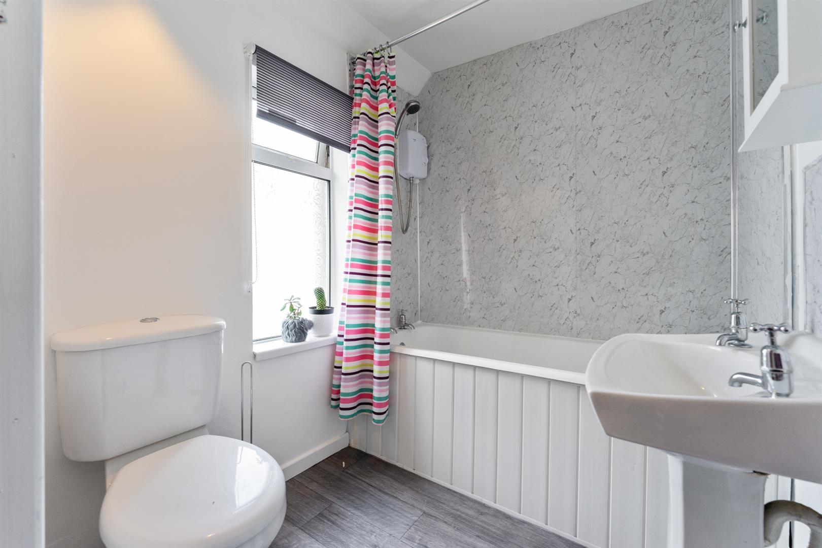White suite comprising wood panelled bath with mixer tap, low flush wc, pedestal wash hand basin with mixer tap and tiled splashback, vinyl flooring.