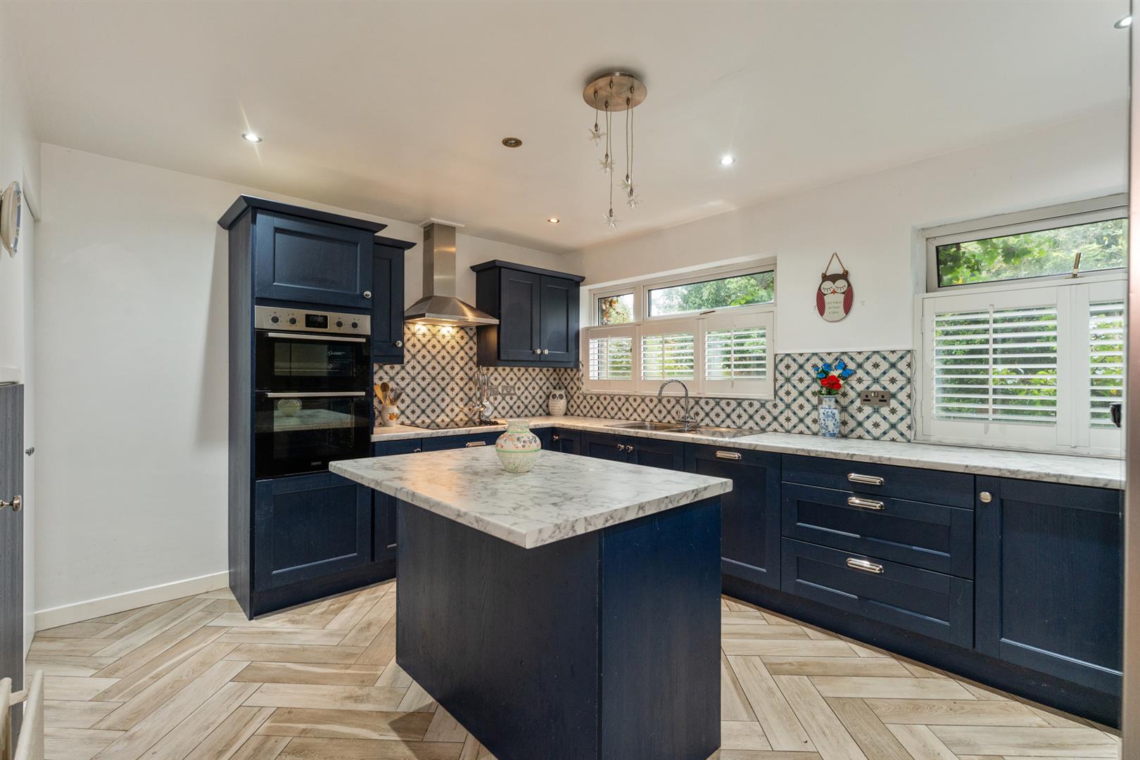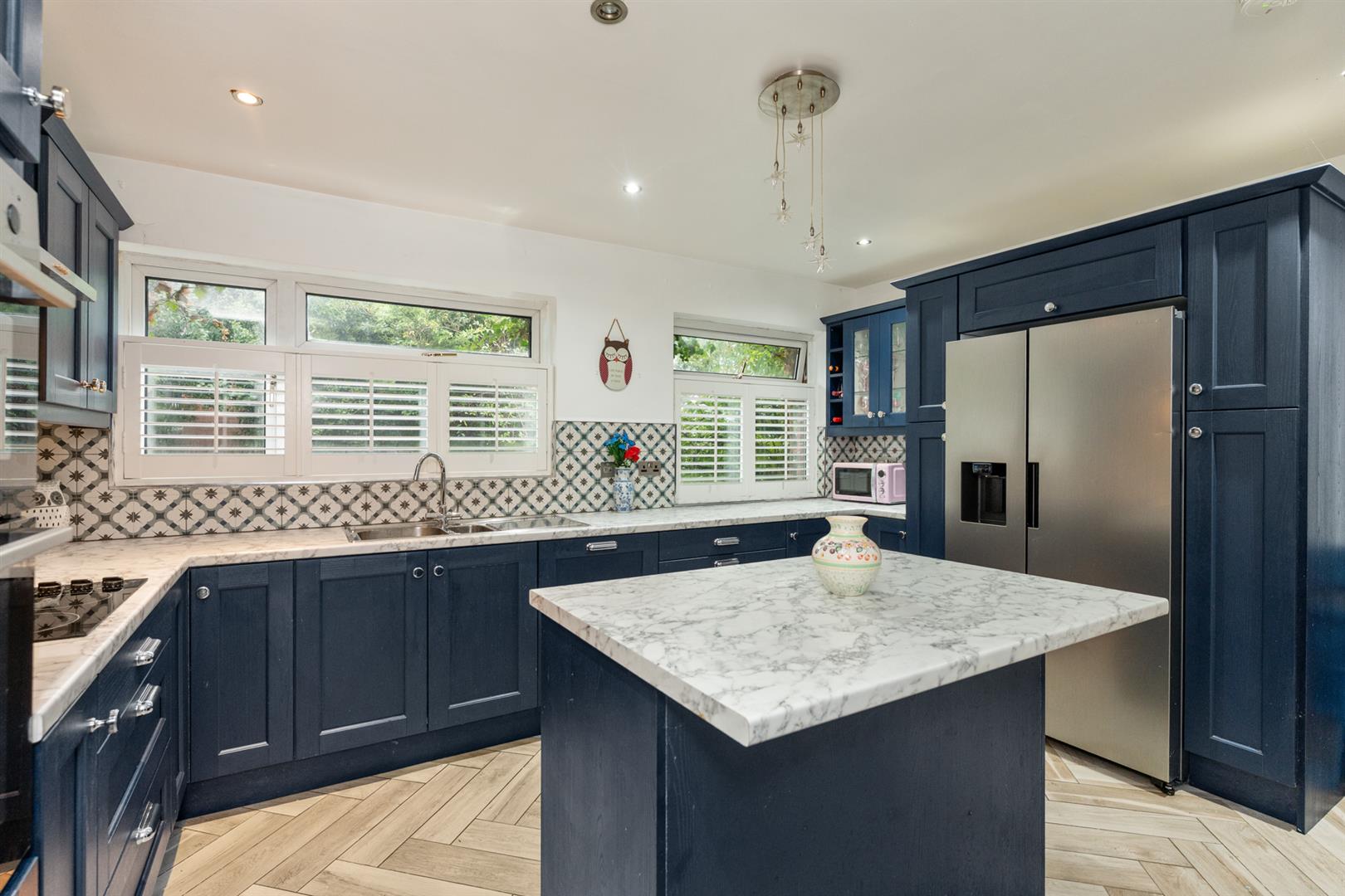 Extensive range of high and low level units, laminate work surfaces, 1 1/4 bowl single drainer stainless steel sink unit with mixer tap, integrated split level stainless steel oven, integrated four ring ceramic hob, stainless steel extractor fan, integrated dishwasher, plumbed for ice dispensing fridge/ freezer, concealed low voltage spotlights, island with laminate work surfaces, part tiled walls, ceramic tile flooring, recessed spotlights, storage cupboard.