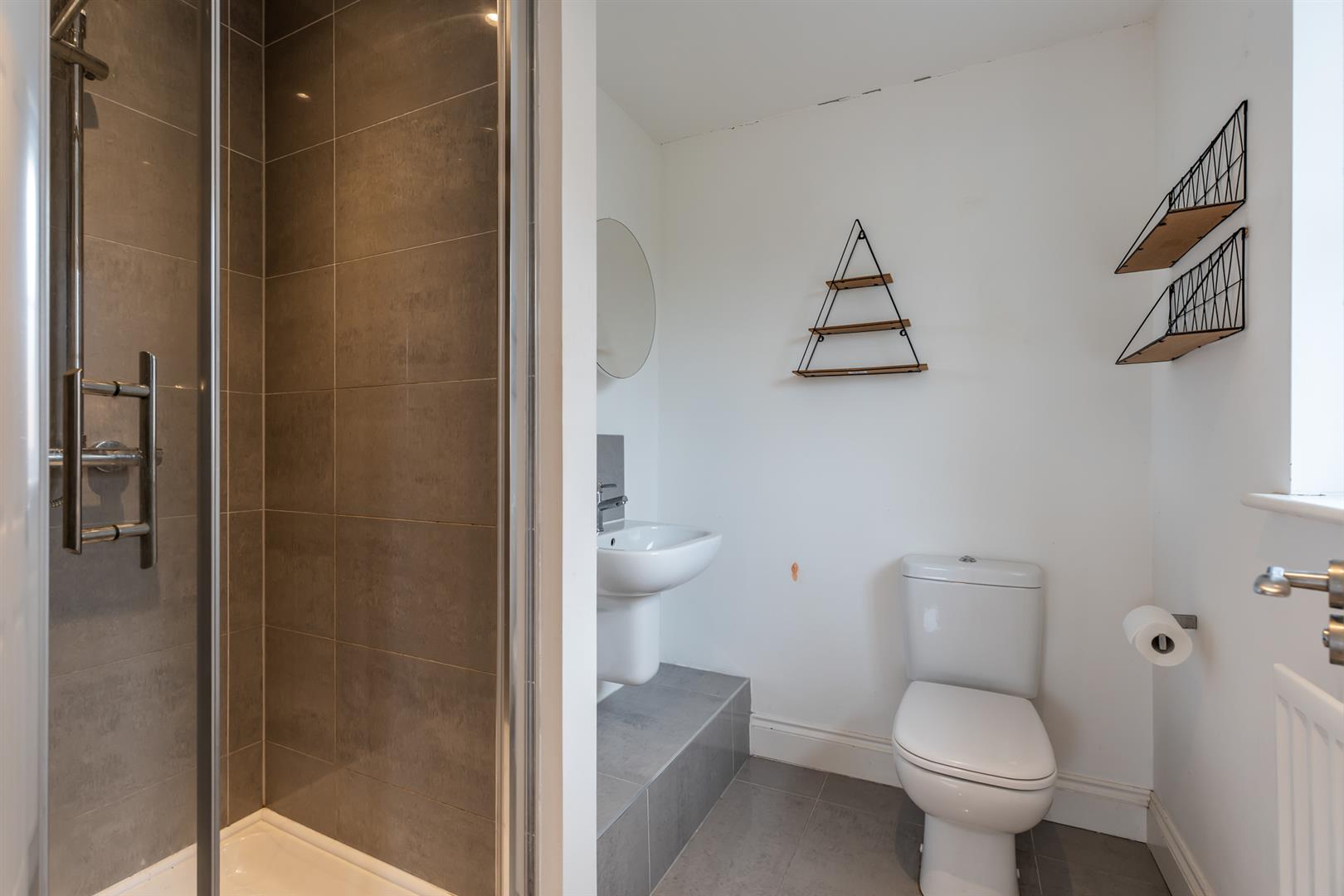 White suite comprising tiled shower cubicle with overhead rainfall shower, low flush wc, semi-pedestal wash hand basin with mixer tap and tiled splashback, tiled flooring, partially tiled walls, recessed spotlighting, extractor fan.