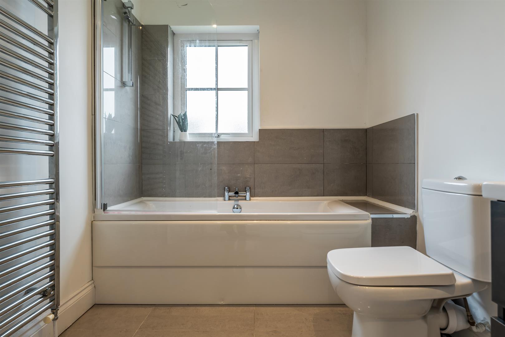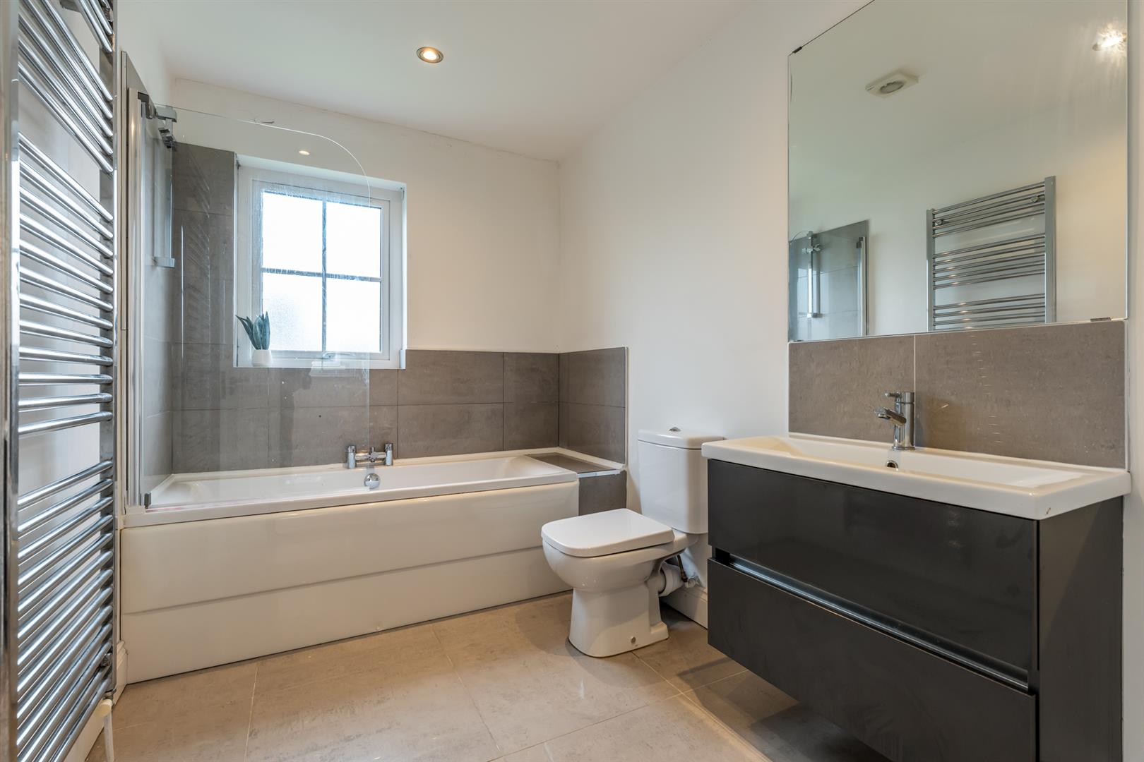 White suite comprising panelled bath with mixer tap and glass shower screen, low flush wc, vanity unit with mixer tap and tiled splashback, tiled flooring, partially tiled walls, recessed spotlighting, extractor fan and heated towel rail.