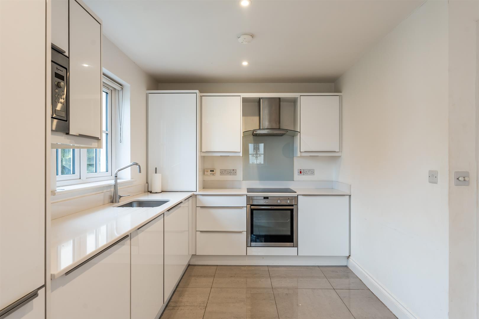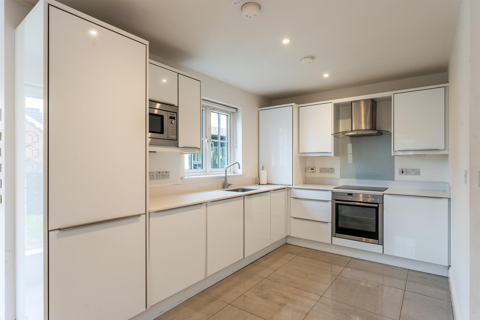 Range of high and low units with Quartz worktops and upstands, undermounted sink with mixer tap, integrated appliances to include; oven, four ring electric hob, dishwasher, integrated fridge/freezer, stainless steel extractor fan hood, and microwave, ceramic tiled flooring, recessed spotlighting.