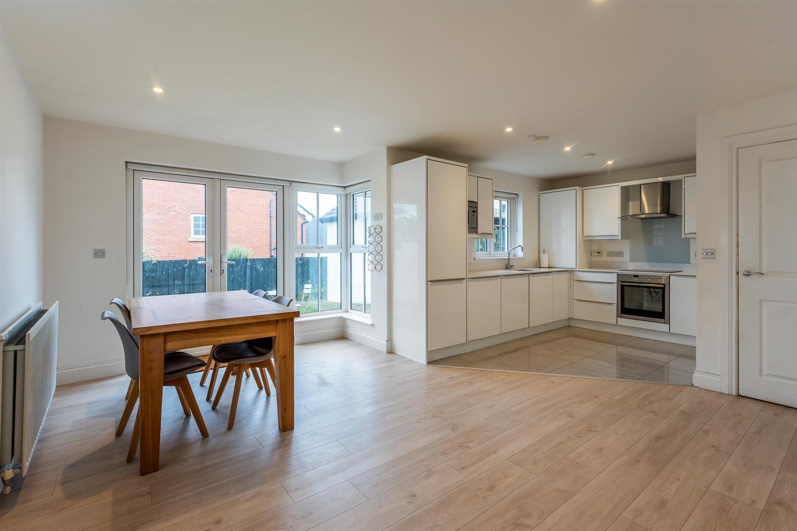 Built only a few years ago (2015), this detached home of approximately 1,250 sq ft occupies a lovely corner site and provides bright, spacious accommodation over two floors. The ground floor comprises a welcoming hallway with a modern guest WC, a generous dual-aspect lounge with feature open fireplace, and a large kitchen/dining/sun room forming the heart of the home. The kitchen boasts a superb range of modern fitted units with integrated appliances and patio doors opening to the enclosed rear garden, perfect for entertaining or relaxing.
