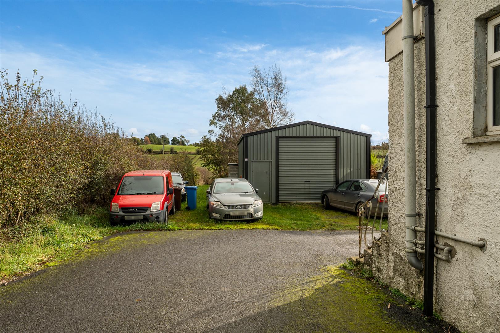 Front; Tarmac driveway and area in lawn.