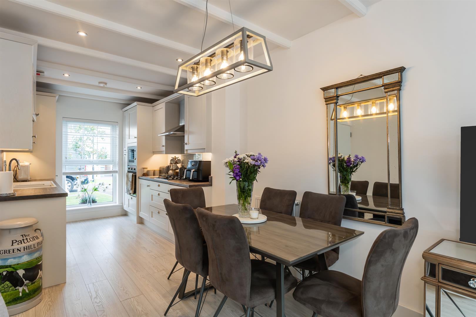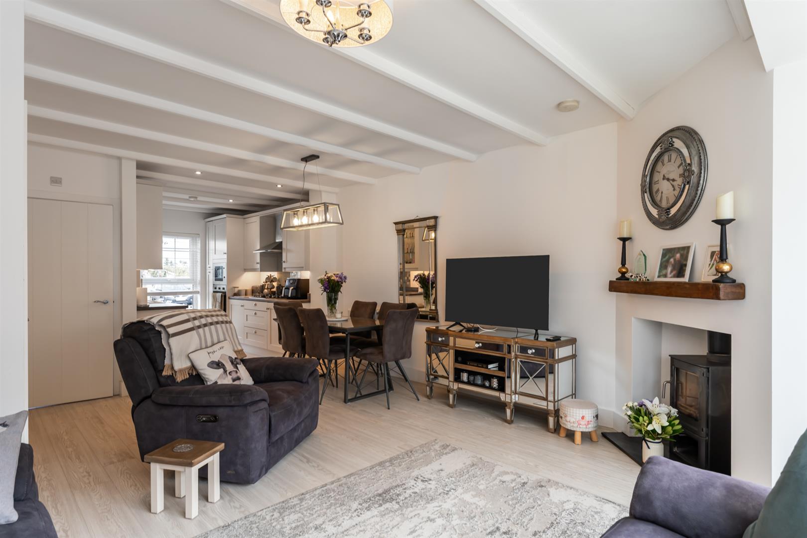 The entrance hall opens to a charming ground floor WC and a spacious open-plan kitchen, living, and dining area, centred around a stylish wood-burning stove. The kitchen features an excellent range of high and low-level units, integrated appliances, and attractive glazed display cabinetry, creating both practicality and visual appeal.