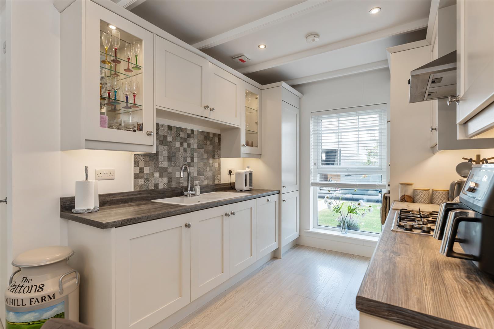 Modern range of high and low level units with wood laminate worktops, inset ceramic sink unit with with mixer tap and built in drainer, integrated appliances to include; dishwasher, fridge freezer, four ring gas hob, mid-level oven, stainless steel extractor hood and microwave, feature glazed units, wood laminate flooring, recessed spotlights and larder cupboard.
