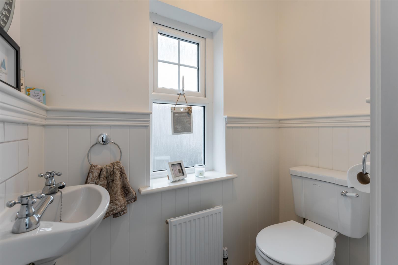 White suite comprising low flush w/c, wall mounted sink, tiled splashback, extractor fan, part wood panelled walls and ceramic tiled floor.
