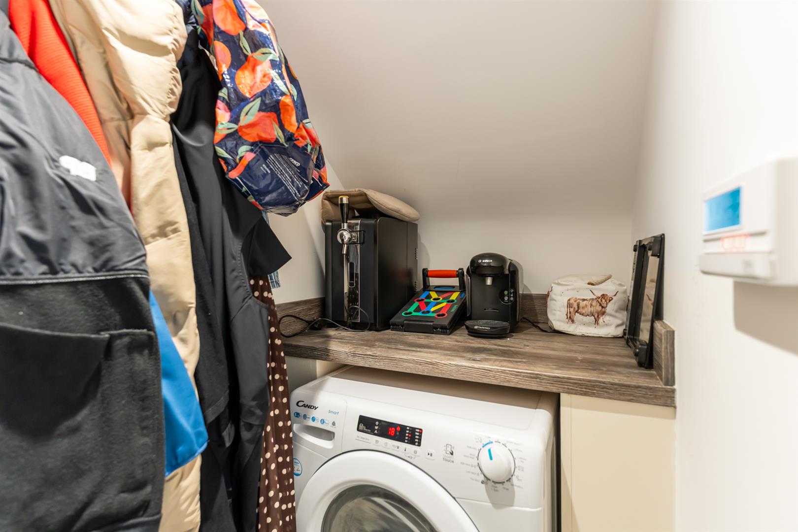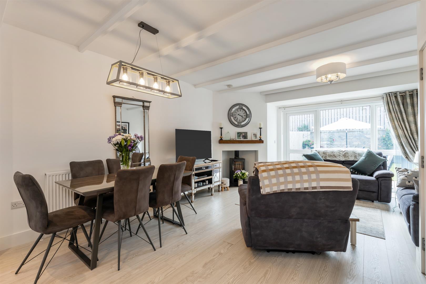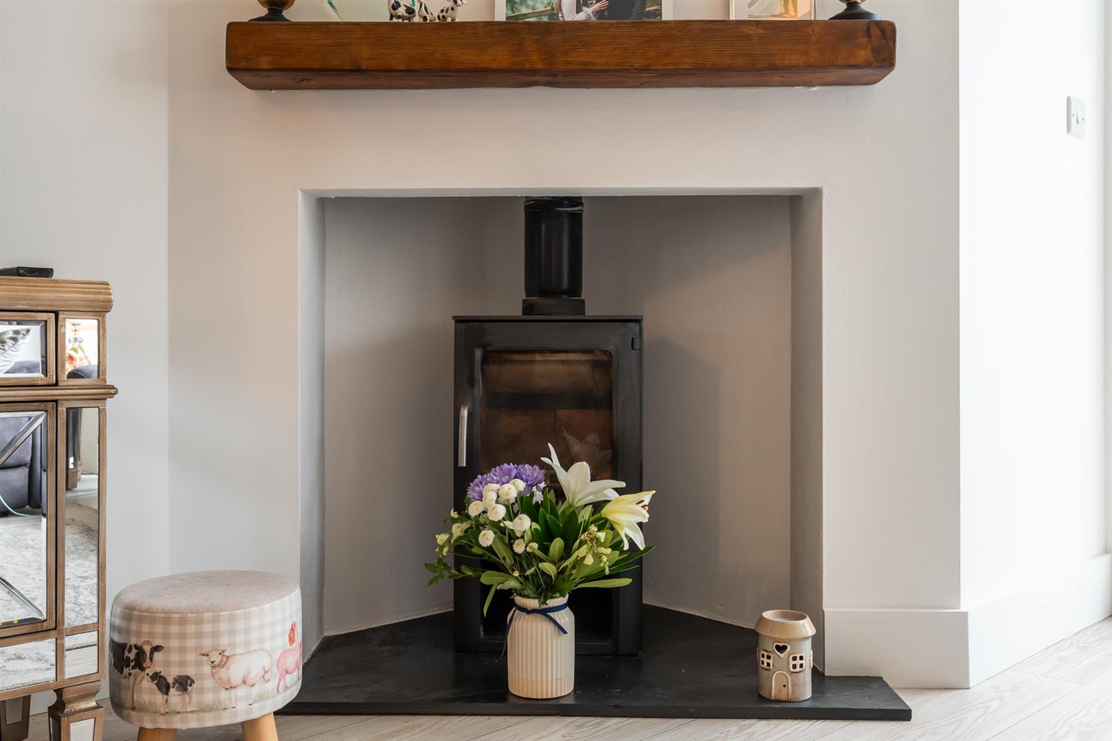 Wood laminate flooring, wood-burning stove with tiled hearth and wooden mantle and space for dining area. Understairs storage, plumbed for washing machine. Access to rear garden.