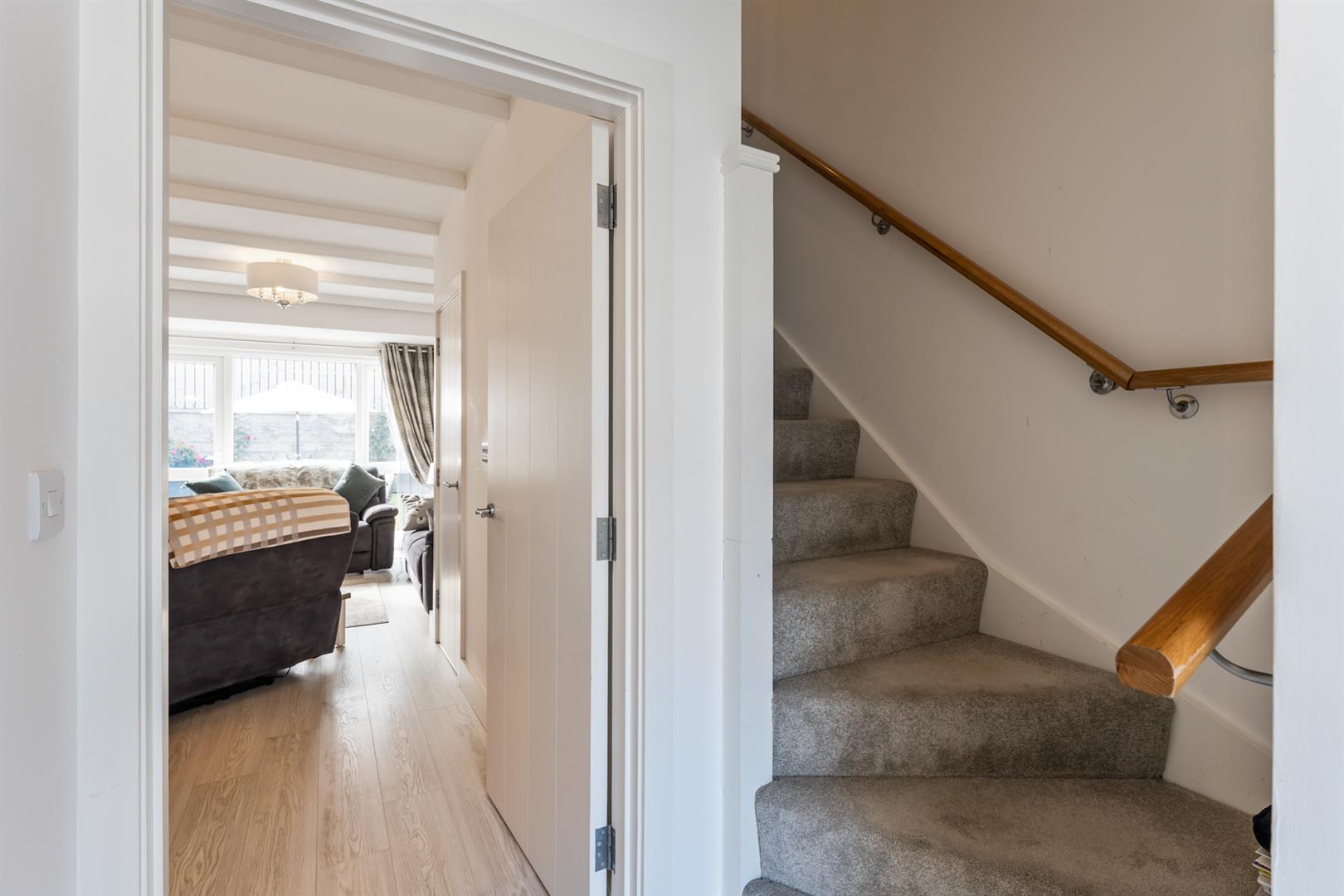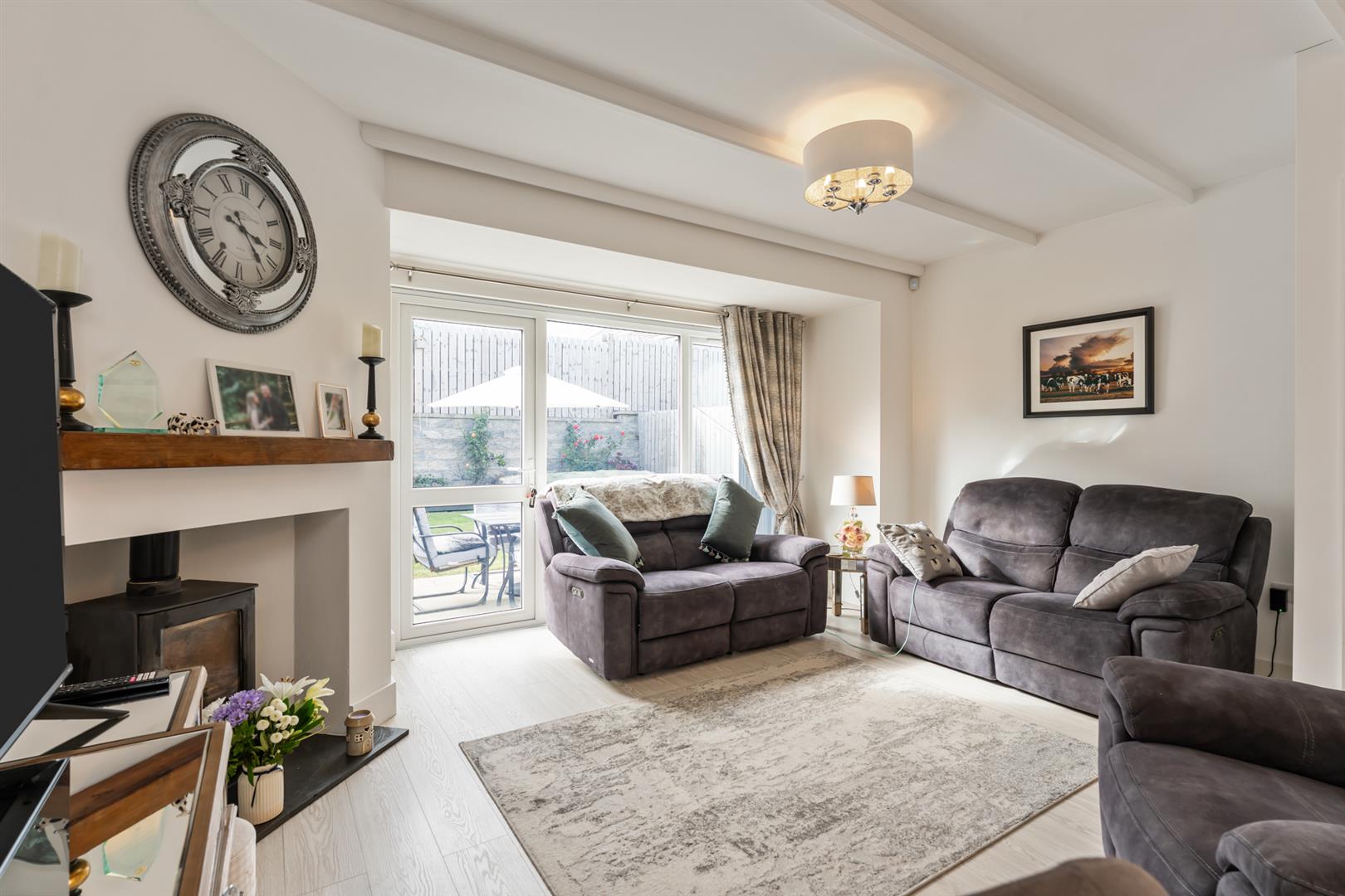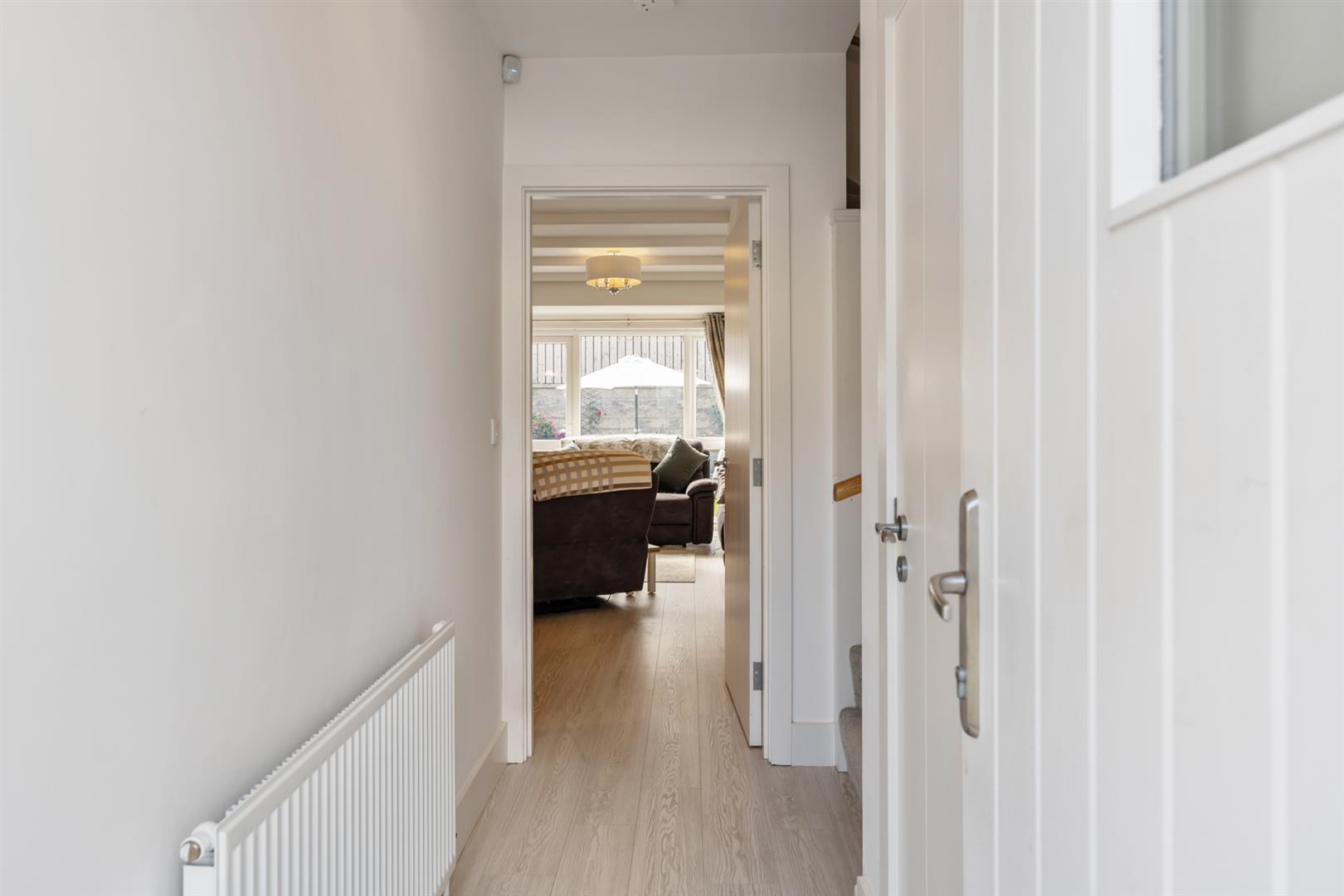 Wood laminate flooring, wood-burning stove with tiled hearth and wooden mantle and space for dining area. Understairs storage, plumbed for washing machine. Access to rear garden.