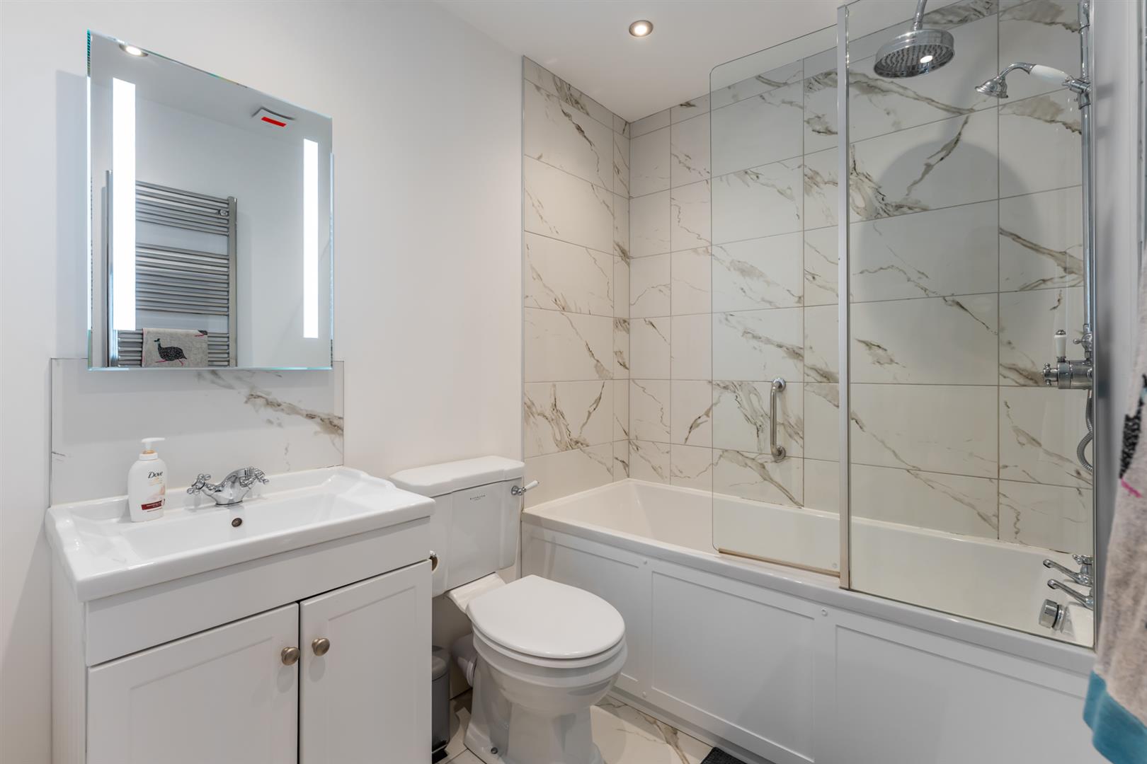 Modern white suite comprising panelled bath with overhead rainfall shower and glass shower screen, vanity unit with tiled splashback, storage and mixer tap, low flush w/c, recessed spotlights, extractor fan and tiled floor.