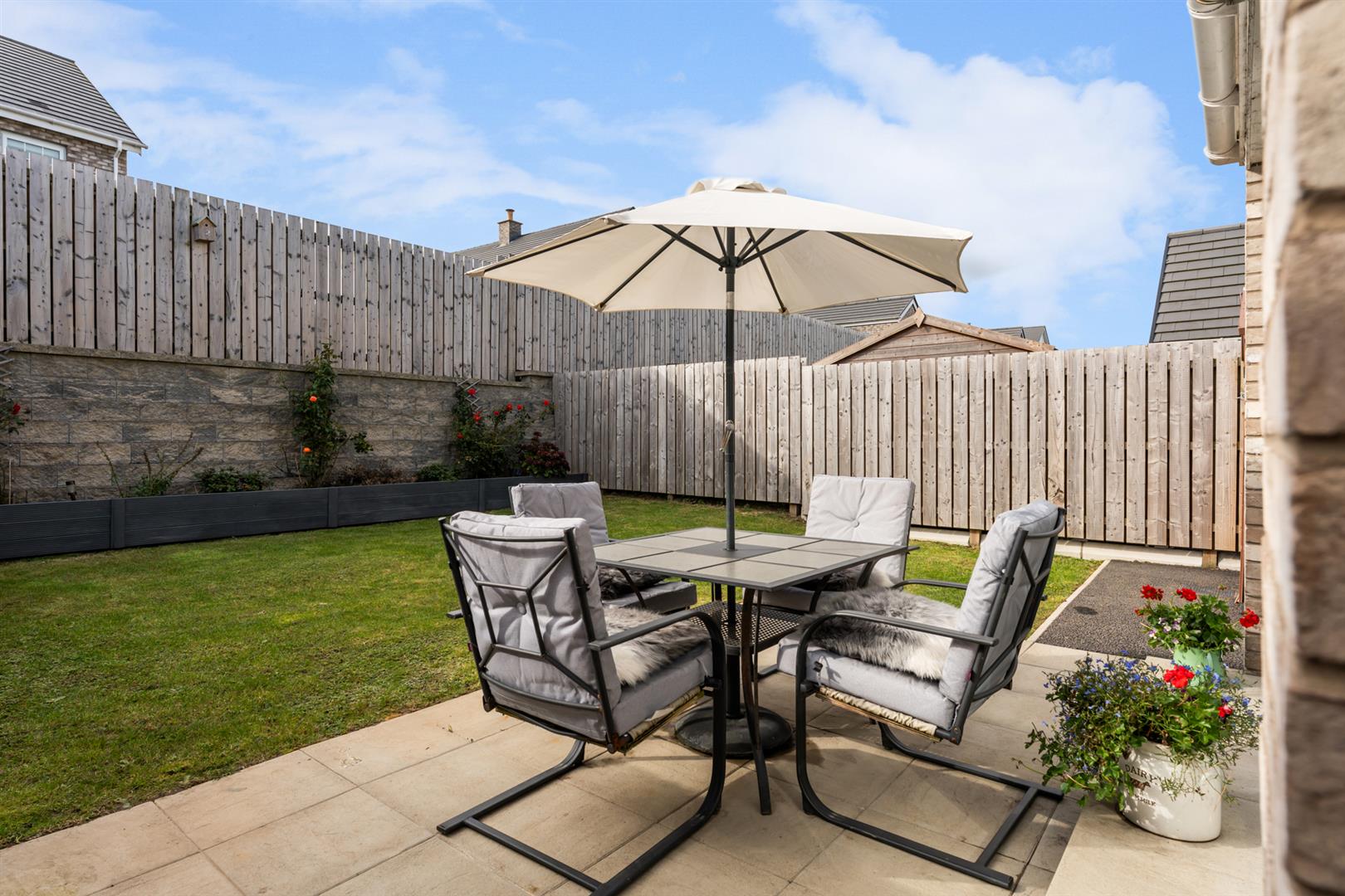 Rear - Fully enclosed rear garden with patio area, area in lawn, space for shed, outside tap and light.