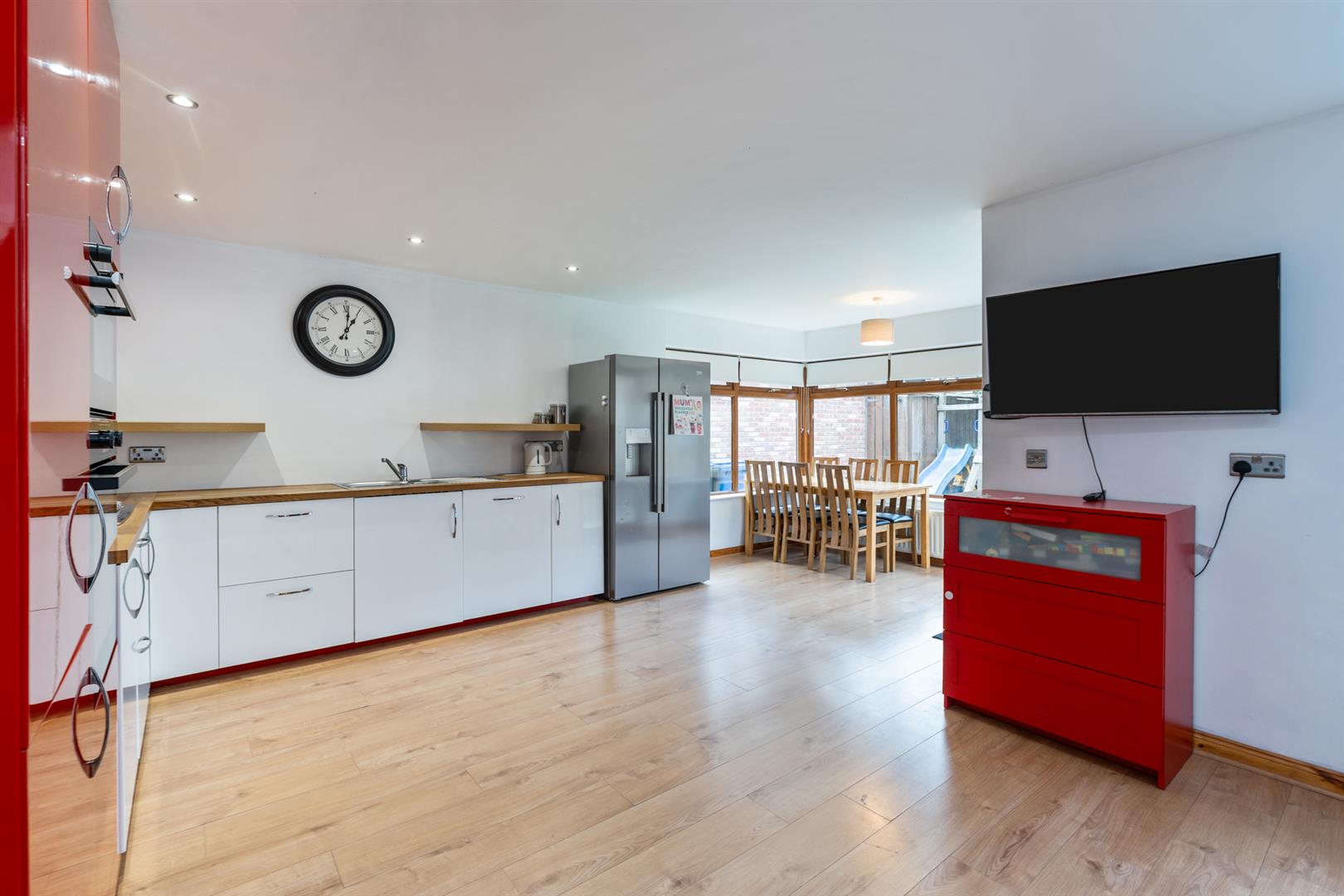 Modern range of high and low level units, solid wood work surfaces, inset stainless steel sink unit with mixer tap and drainer, integrated appliances to include; dishwasher, double oven and 5 ring gas hob, larder cupboard, extractor fan, wood laminate flooring, recessed spotlights, space for dining, access to enclosed rear garden.