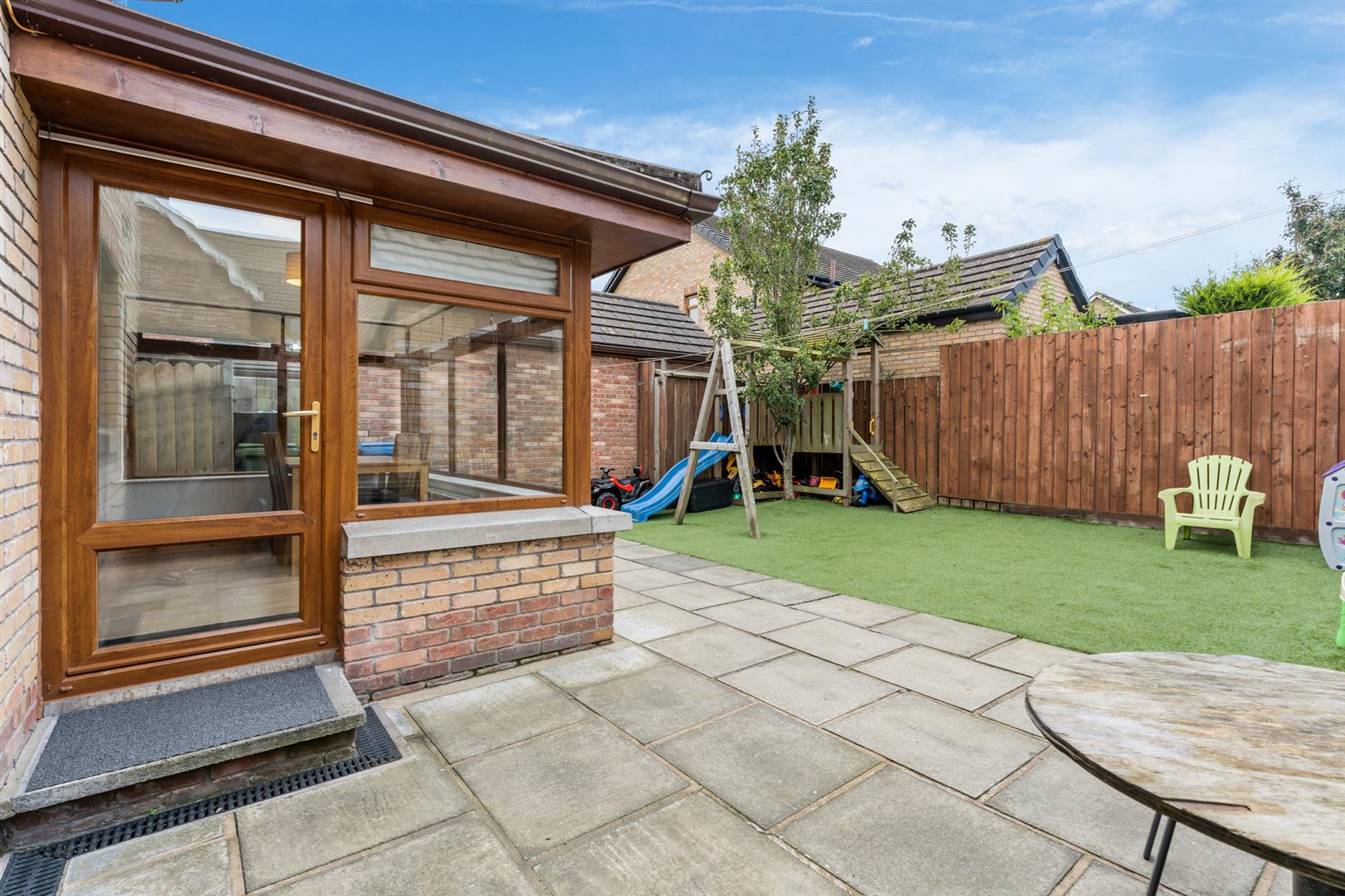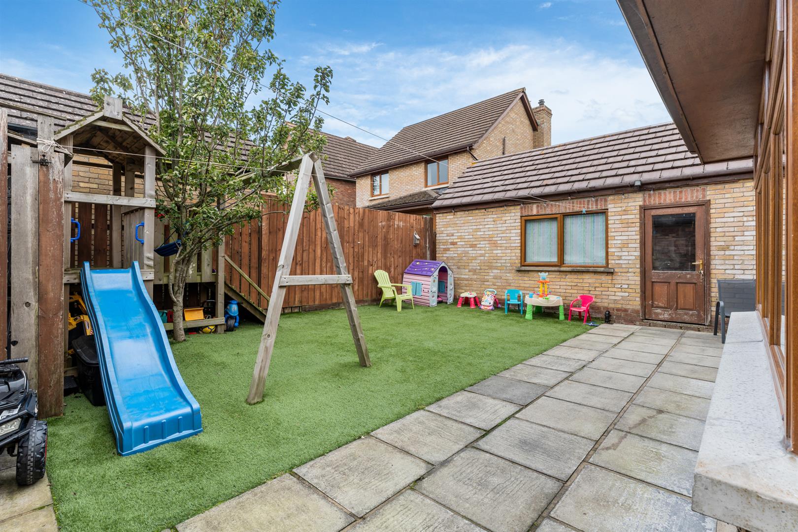 Rear - Enclosed garden with mature trees, artificial lawn, outside tap, outside light, oil storage tank.