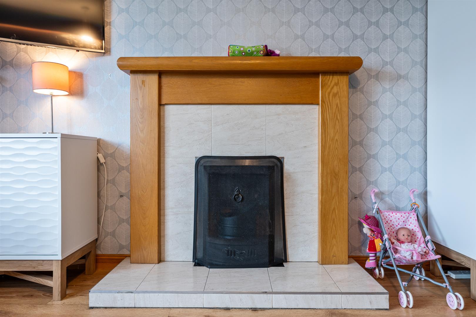 Open fireplace with tile hearth, tile surround and wooden mantle, bay window and vinyl floor.