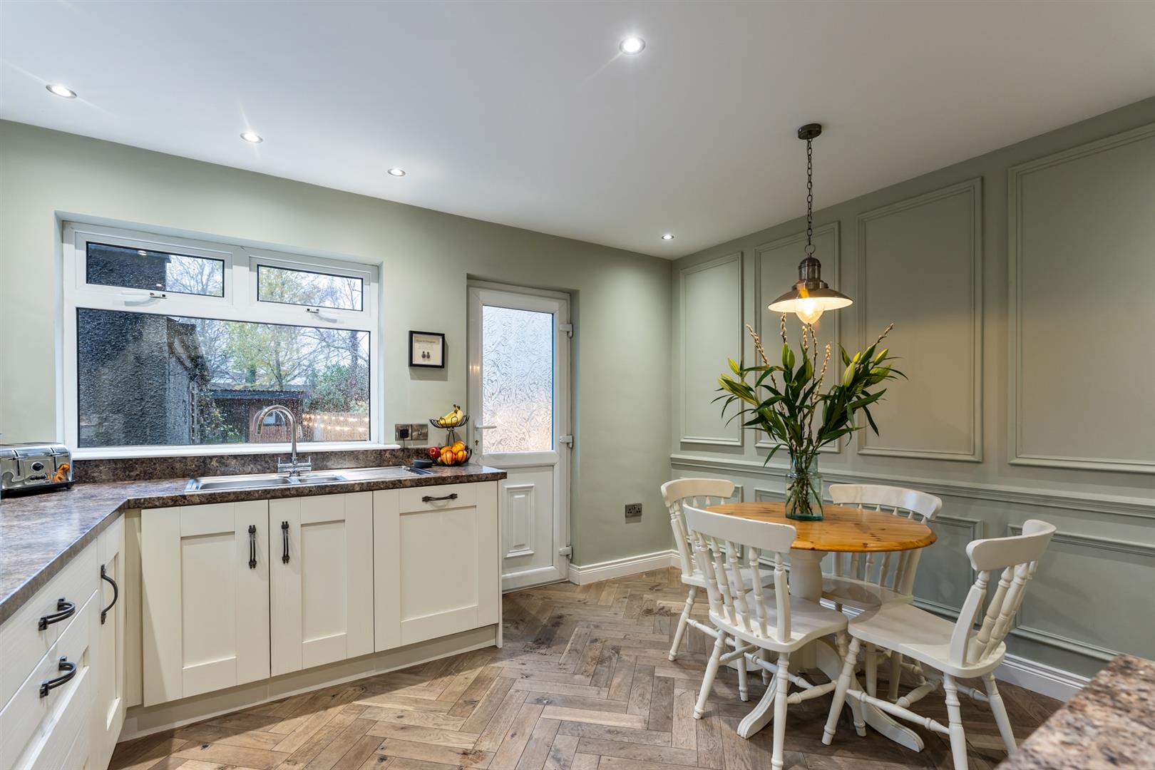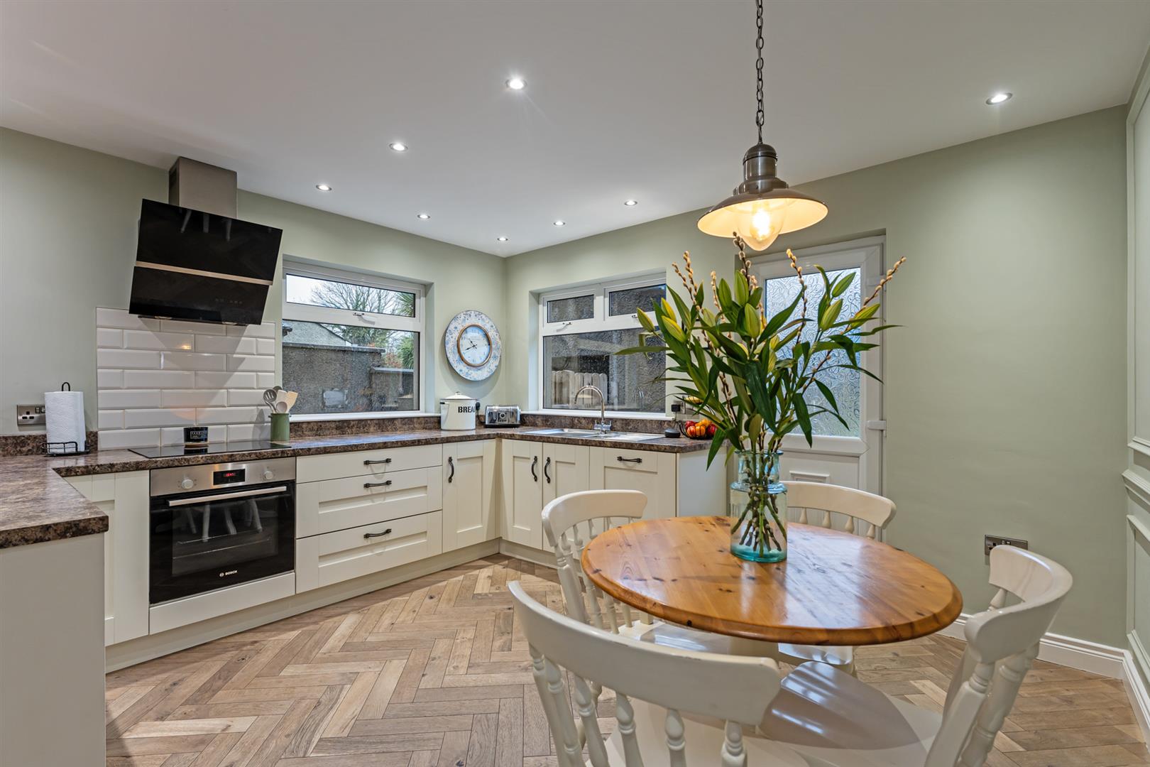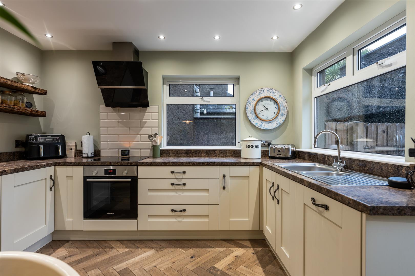 Modern low level units with laminate work surfaces, built in stainless steel sink unit with mixer tap and drainer, integrated appliances to include; oven, four ring electric hob, matte black angled extractor fan and dishwasher, partly panelled walls, solid wood herringbone flooring, recessed spotlighting and access to rear garden.