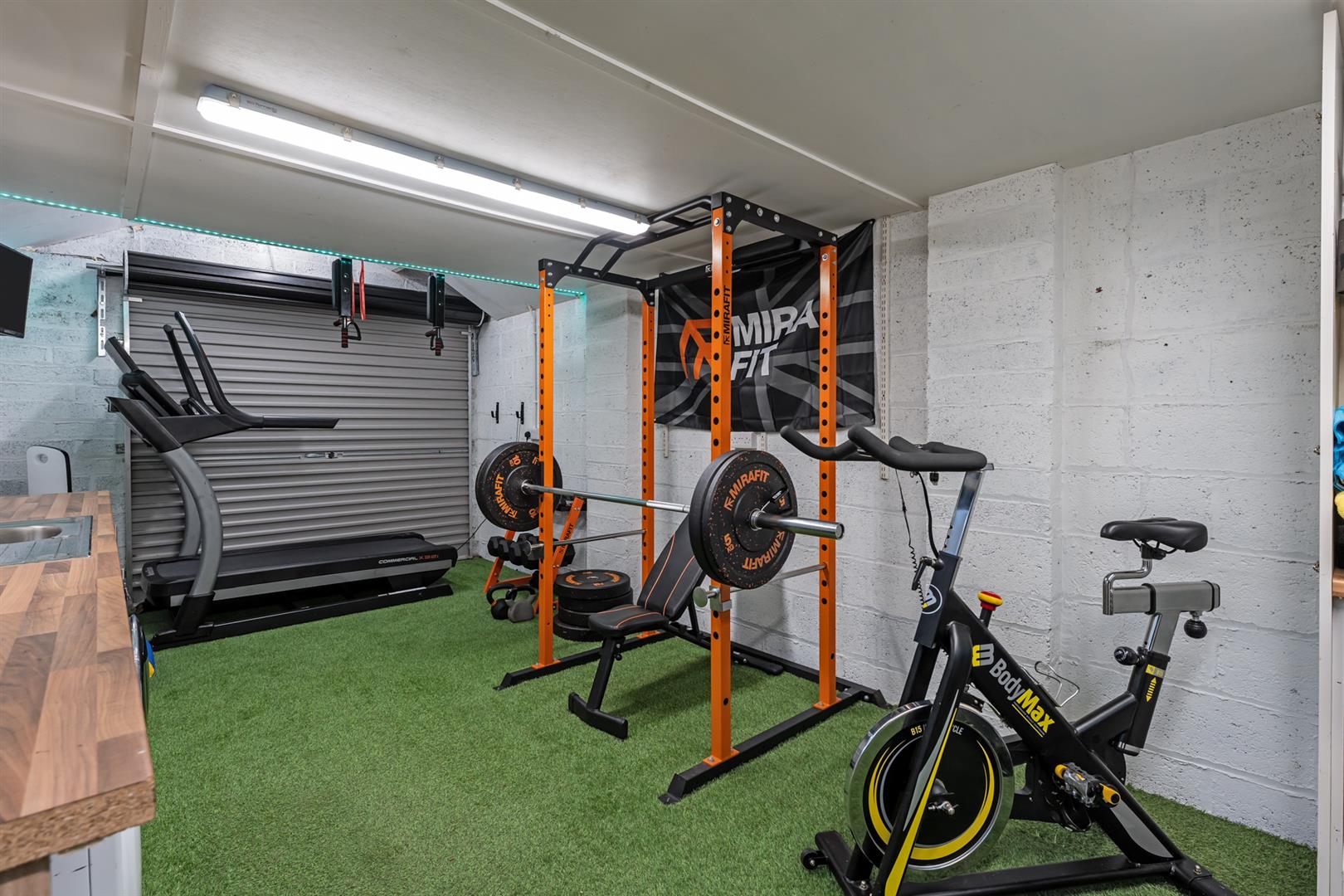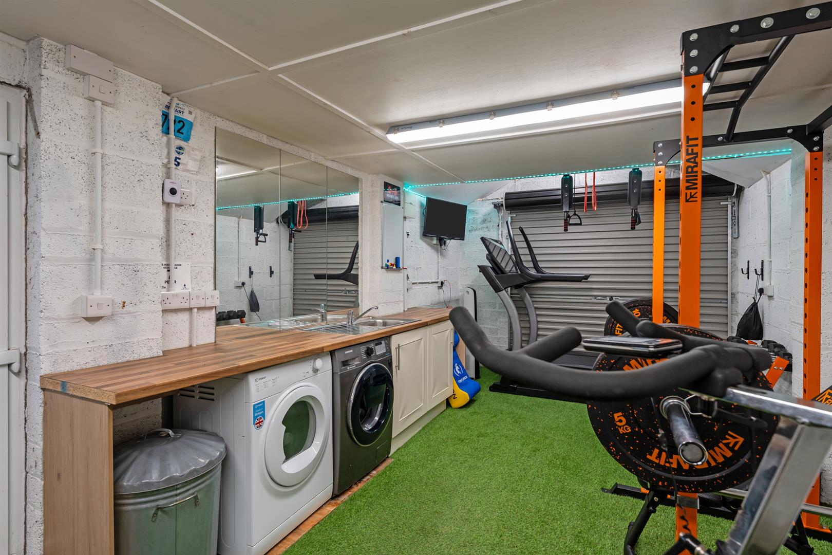 Large garage, roller shutter door, artificial grass, utility area with range of low level units, plumbed for washing machine, space for tumble dryer, stainless steel sink with mixer tap.