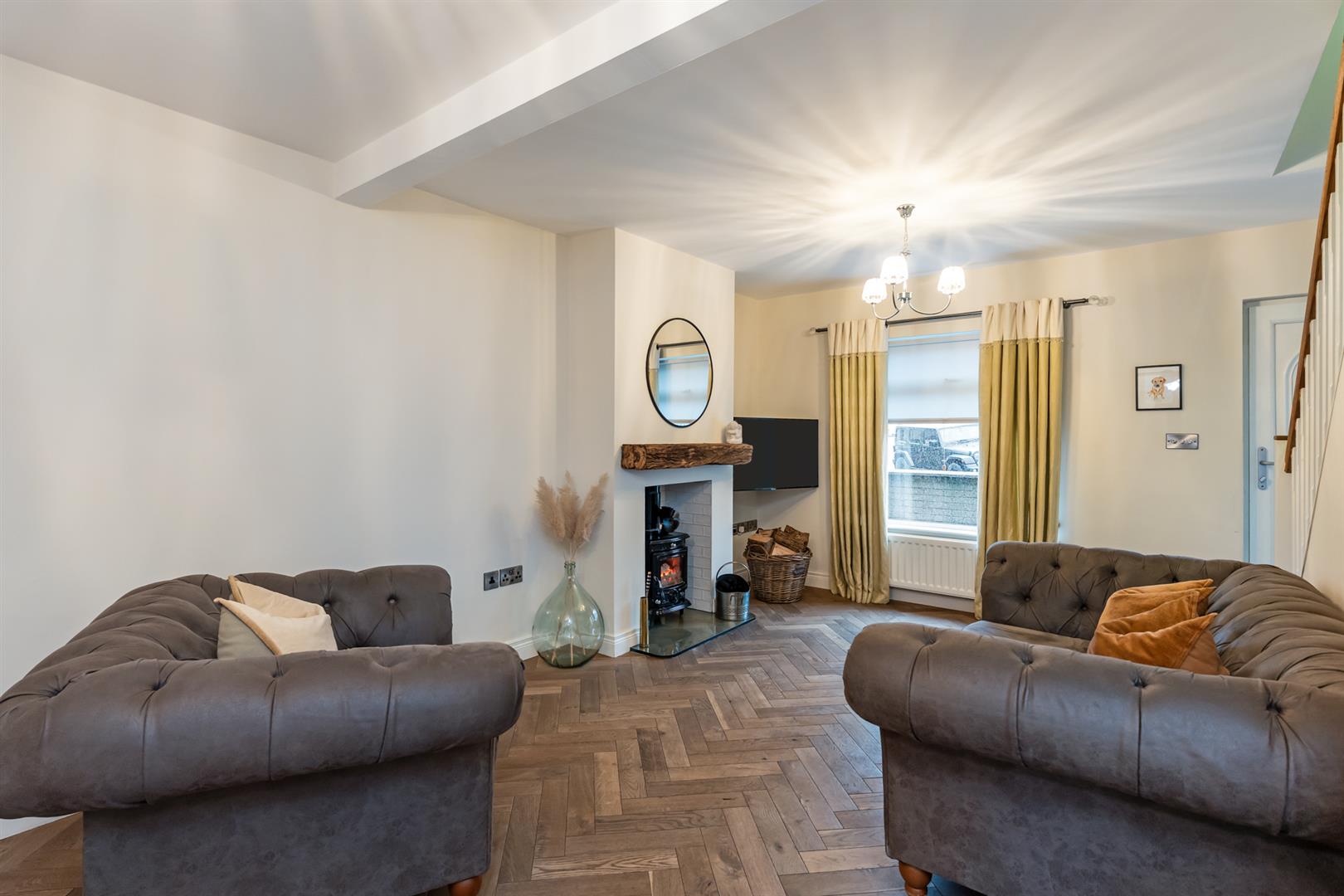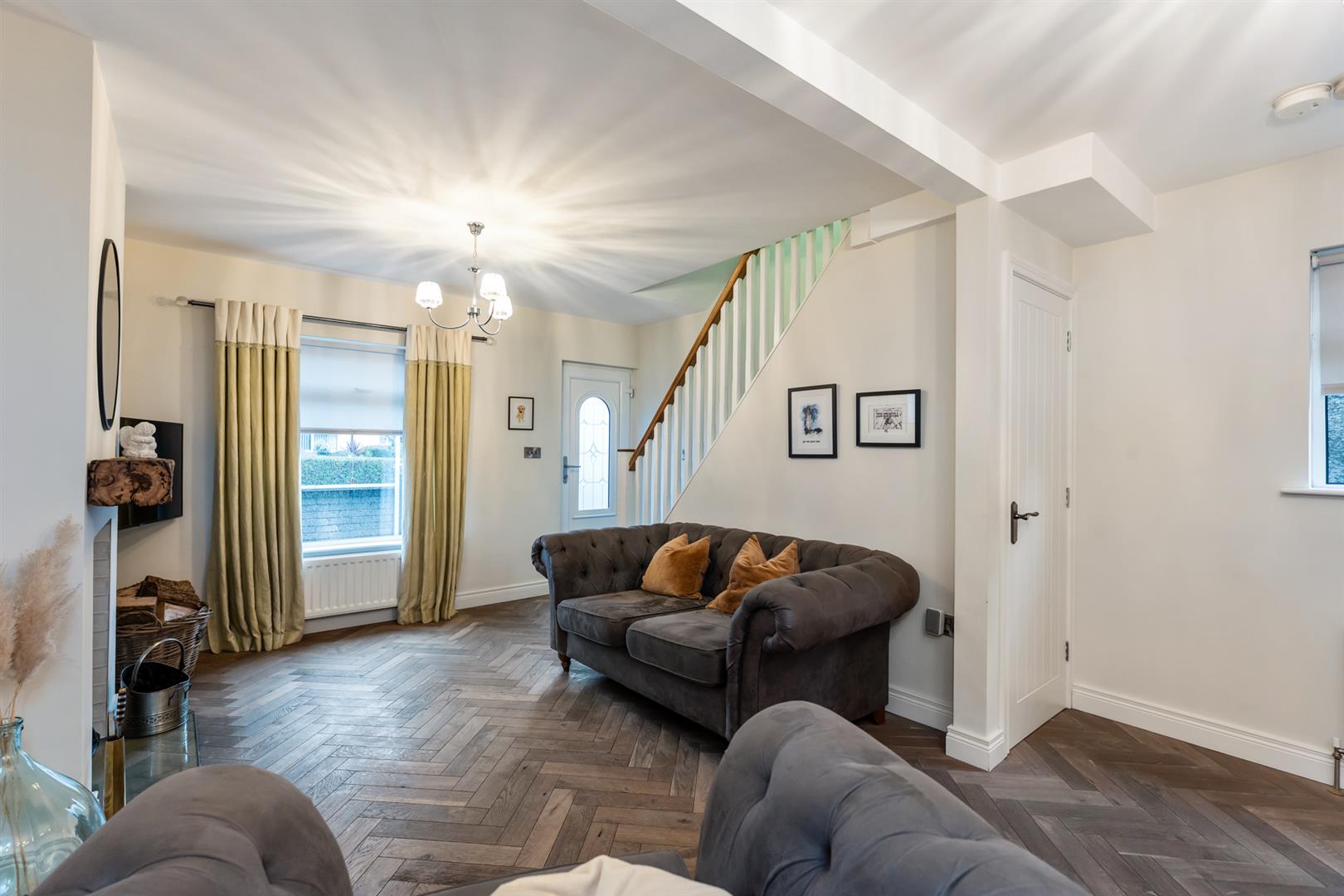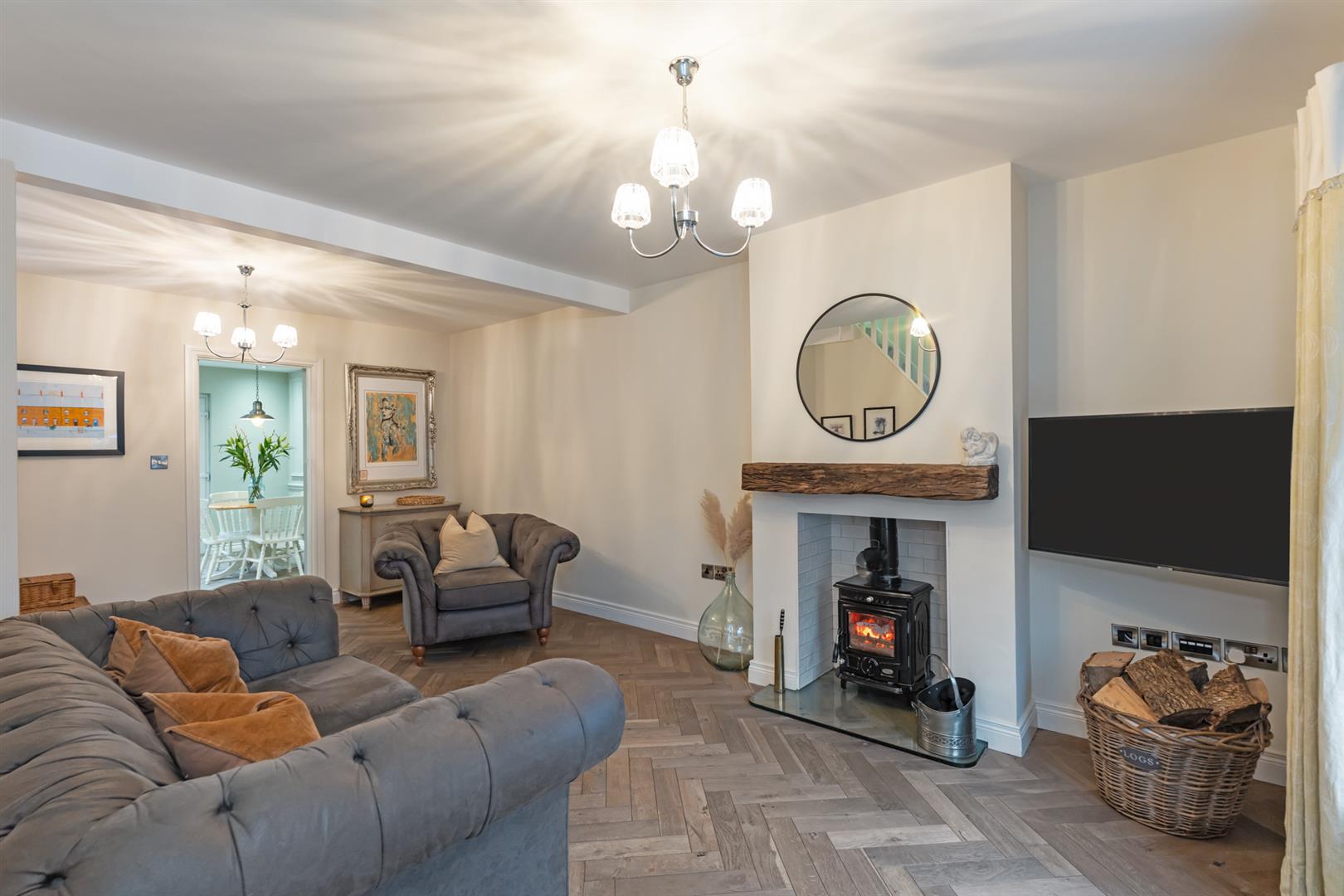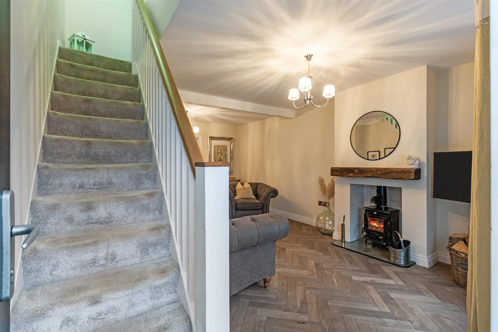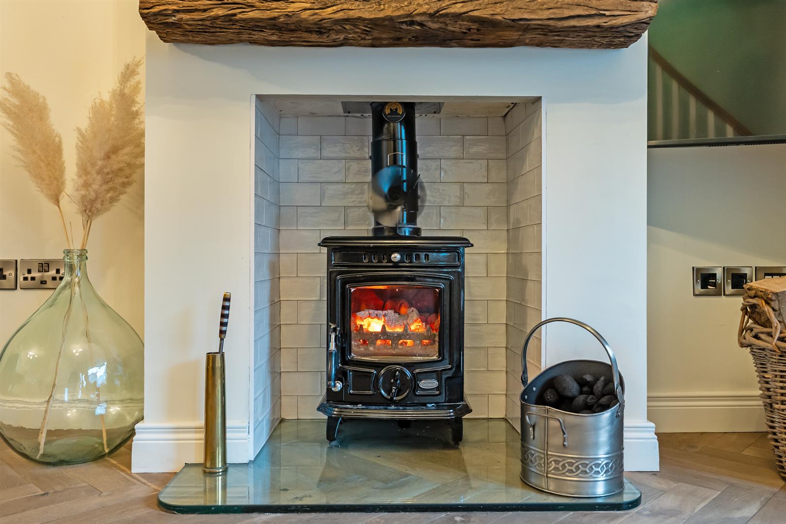 Solid wood herringbone flooring, multi-fuel burning stove with wooden mantle and under staircase storage.